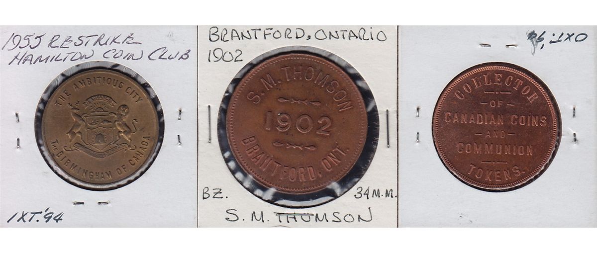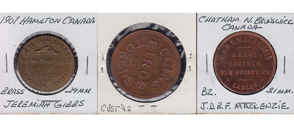 Lot of 3 Numismatists Tokens. J.D.B.F. MacKenzie, Chatham, New Brunswick, McColl # 816, copper, AU, S.M. Thomson, Brantford, ON, Mc Coll 806b, UNC, Jeremiah Gibbs, Hamilton, ON, brass, AU. 3 Pcs.