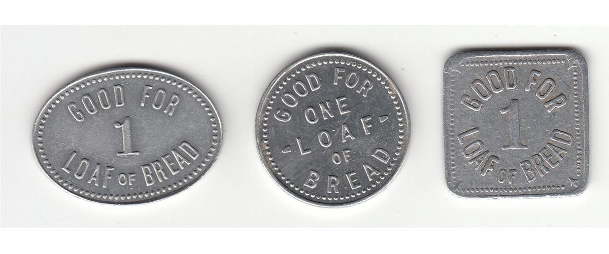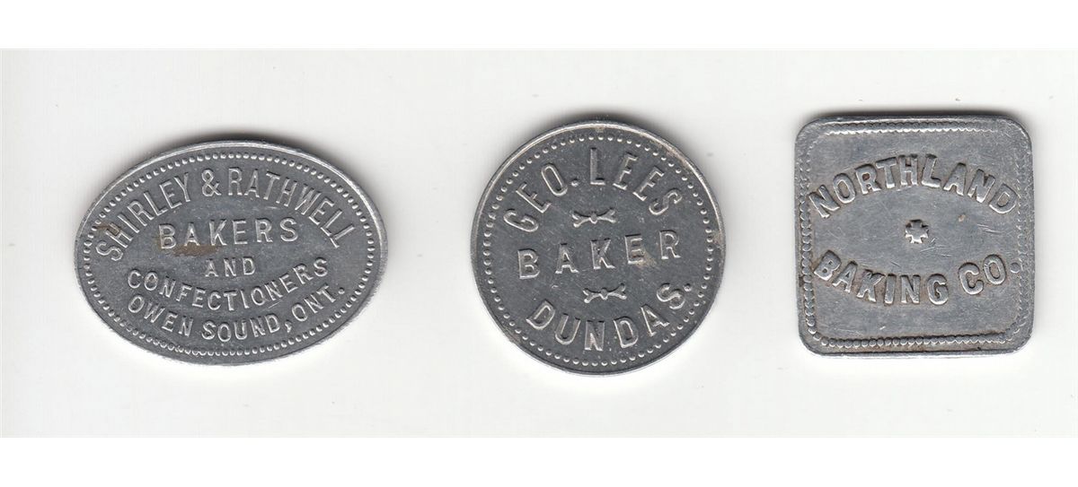 Lot of 3 Ontario Bread Tokens. Includes: Mc 985, Shirley & Rathwell Owen Sound 1 Loaf. Mc 1068, Geo. Lees Dundas One Loaf. Astwood 1705a, Northland Baking Co. (South Porcupine) 1 Loaf of Bread. EF. 3 Pcs.