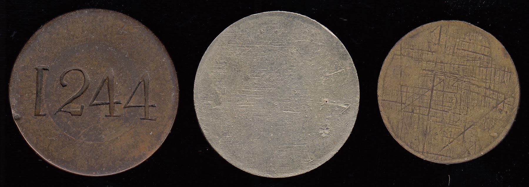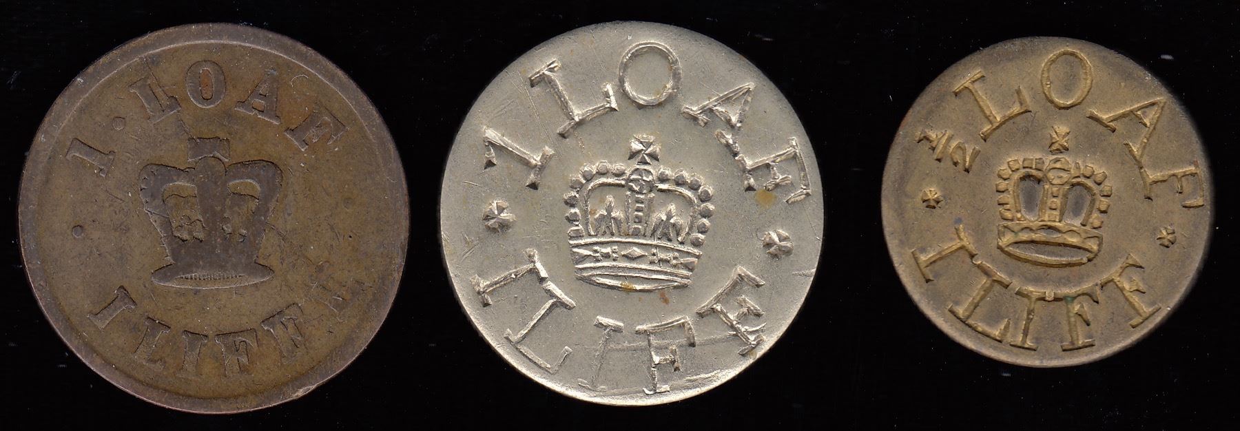 Br. 735, Iliffe, 1 loaf, w. incuse no.1244 on rev., copper, VF; Br. 735a, Iliff, 1 loaf, all incuse, white metal, Unc.; Br. 736a, Illif, ½ loaf, incuse, brass, AU. 3 Pcs.