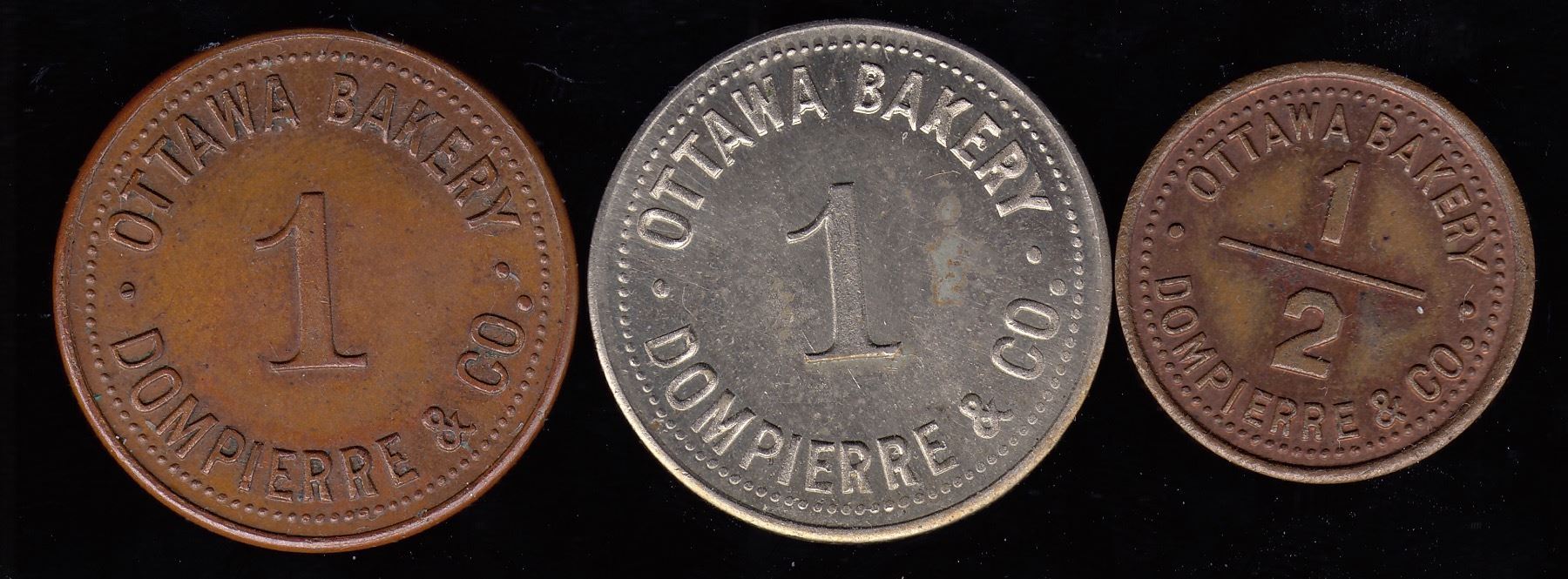 Br. 739, Ottawa Bakery, 1, copper, Unc.; Br. 739, Ottawa Bakery, 1, German silver, BU; Br. 740, Ottawa Bakery, ½, copper, Unc. lustre. 3 Pcs.