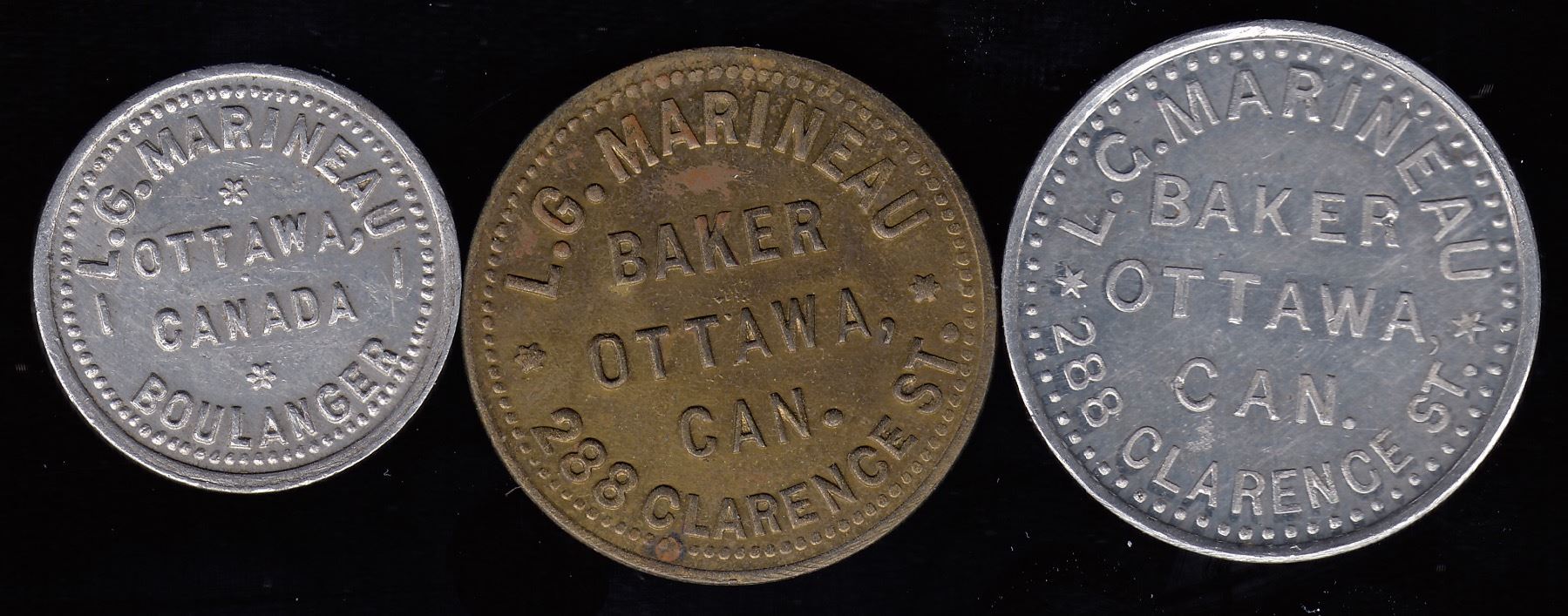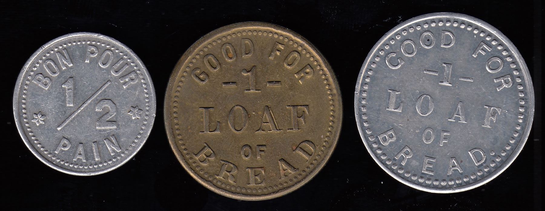 Br. 742, L.G. Marineau, ½ pain, aluminum, Unc.; Br. 743, L.G. Marineau, 1 loaf, aluminum, Unc.; Br. 743, L.G. Marineau, 1 loaf, w/o stop after BREAD, brass, Unc. 3 Pcs.