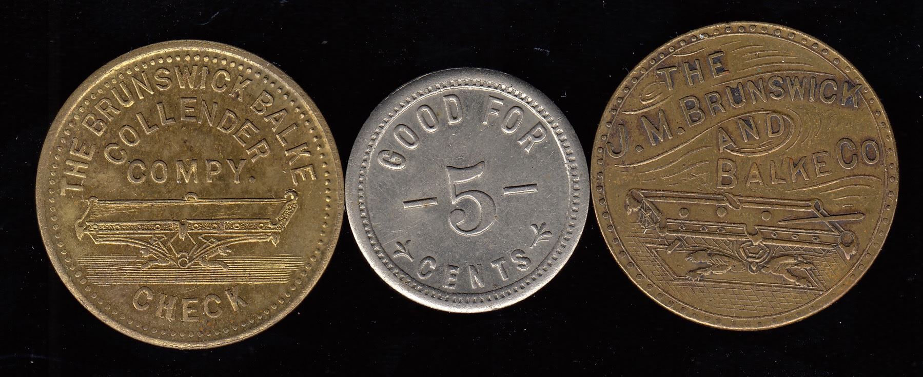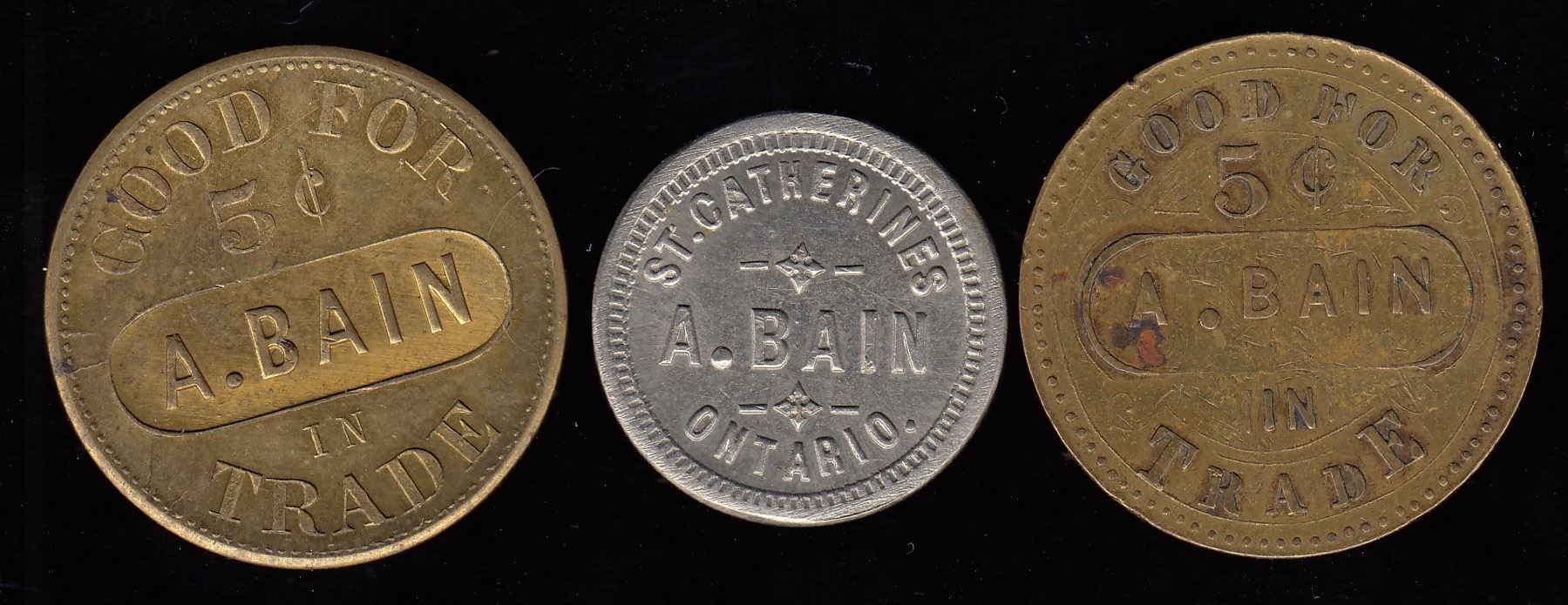 Br. 749, A. Bain, 5?, brass, BU; Br. 750. A. Bain, 5 cents, German silver, Unc; Br. 751, A. Bain, 5?, brass, EF. 3 Pcs.