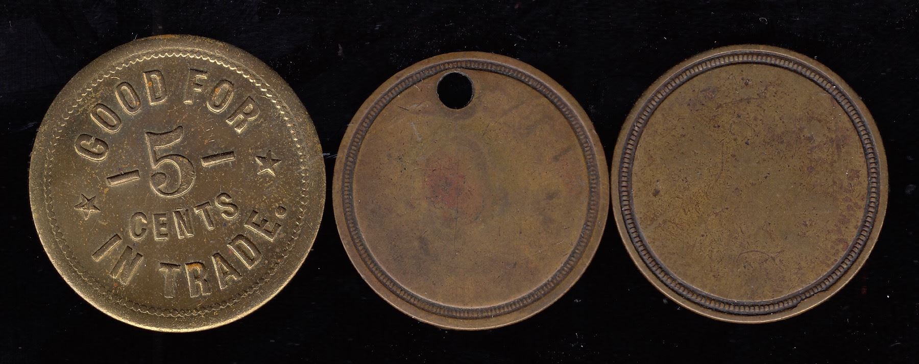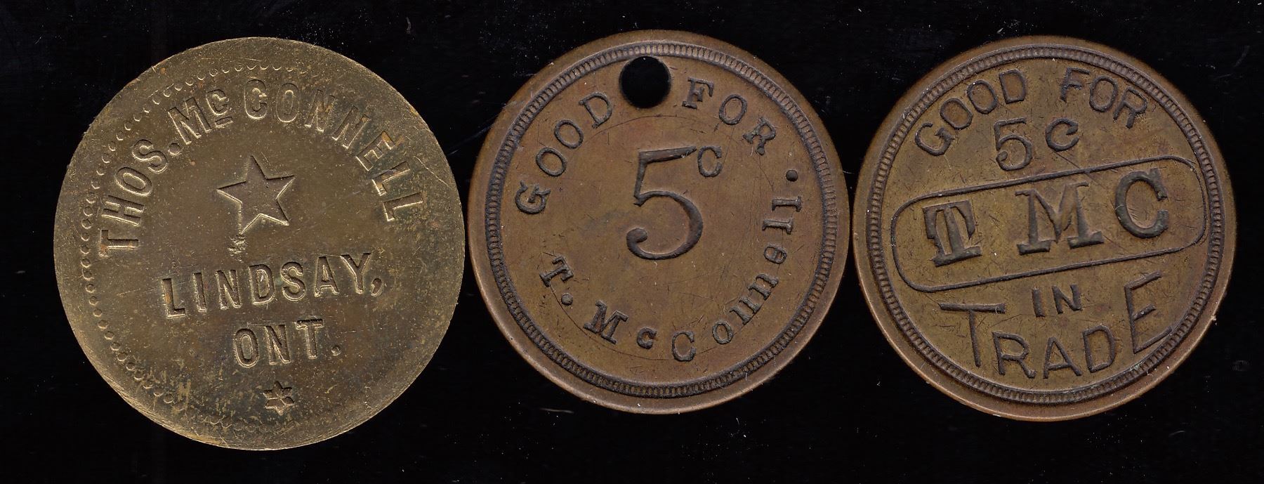Br. 764, Thos. McConnell, 5 cents, brass, BU; Br. 764a, T. McConnell, 5?, brass, incuse and uniface, EF; Br. 764b, TMC, 5?, brass, incuse and uniface, EF. 3 Pcs.