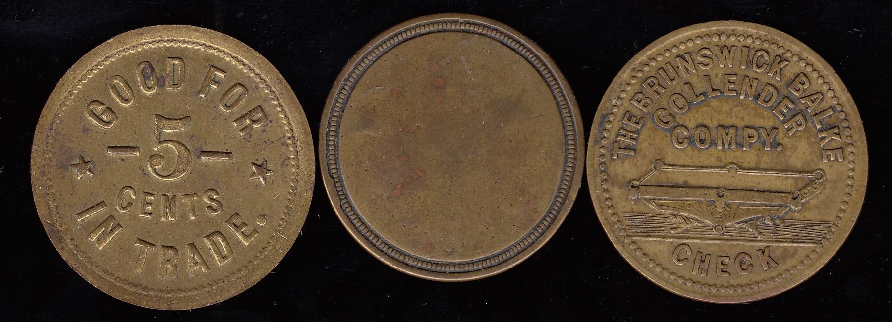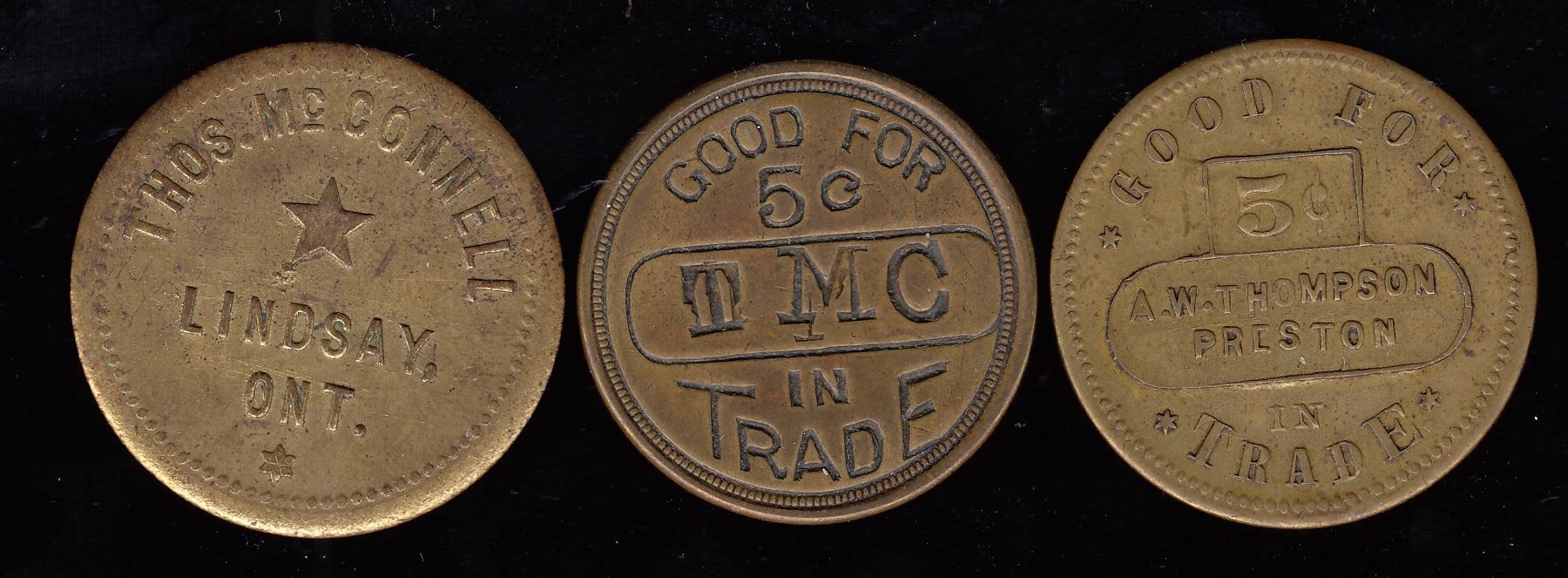 Br. 764, Thos. McConnell, 5 cents, brass, BU; Br. 764b, TMC, 5?, brass, incuse and uniface, AU; Br. 766, A.W. Thompson, 5?, brass, AU. 3 Pcs.