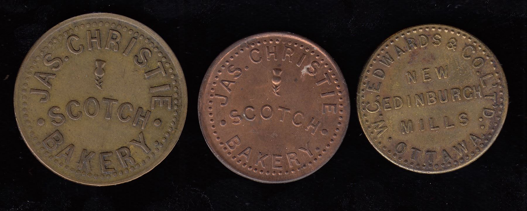 B. 853, Jas. Christie, 1 loaf, brass, Unc; B. 854, Jas. Christie, ½ loaf, copper, BU;