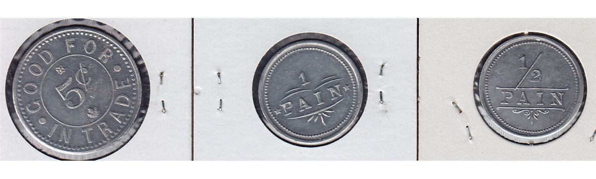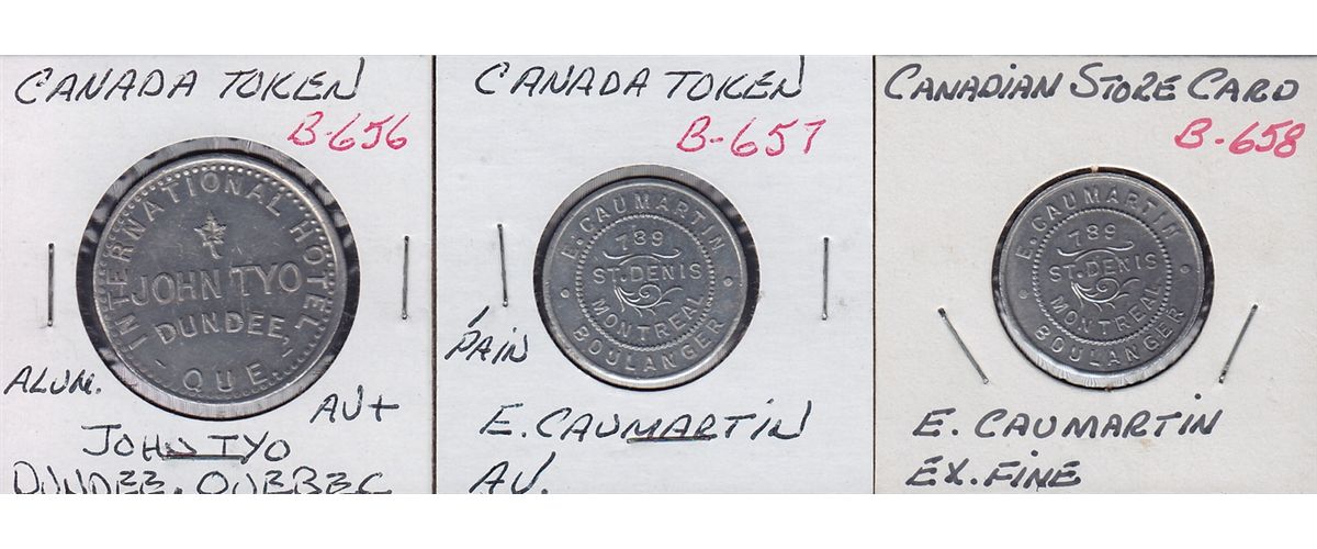Lot of 3 Post Confederation Tokens. Includes: BR 656, John Tyo, Dundee, PQ, Aluminum; BR 657, E. Caumartin, Montreal, PQ, aluminum, AU; BR 658, E. Caumartin, Montreal, PQ, aluminum. 3 Pcs.
