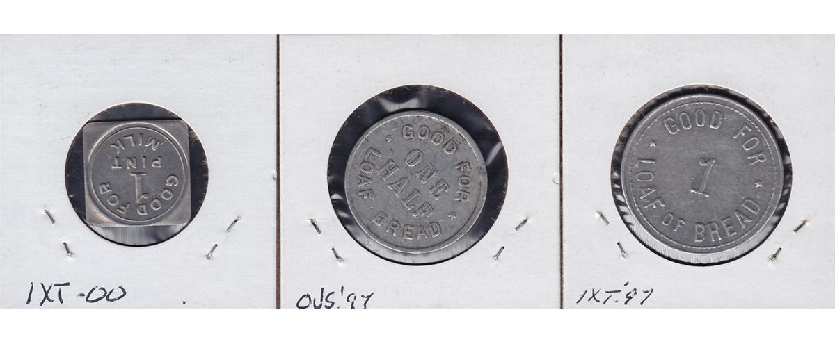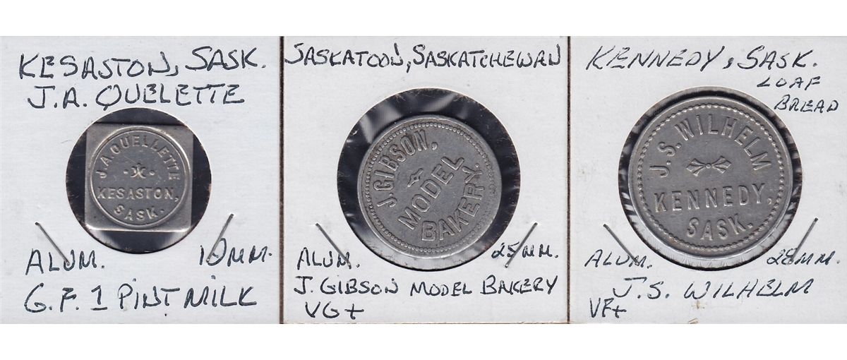 Lot of 3 Saskatchewan Trade Tokens. Includes: Kennedy, SK, J.S. Wilhelm, 1 loaf, AU, aluminum, Kesaston, SK, J.A. Ouelette, 1 pint, AU, aluminum, Saskatoon, SK, J. Gibson, 1/2 loaf, VF, aluminum. 3 Pcs.