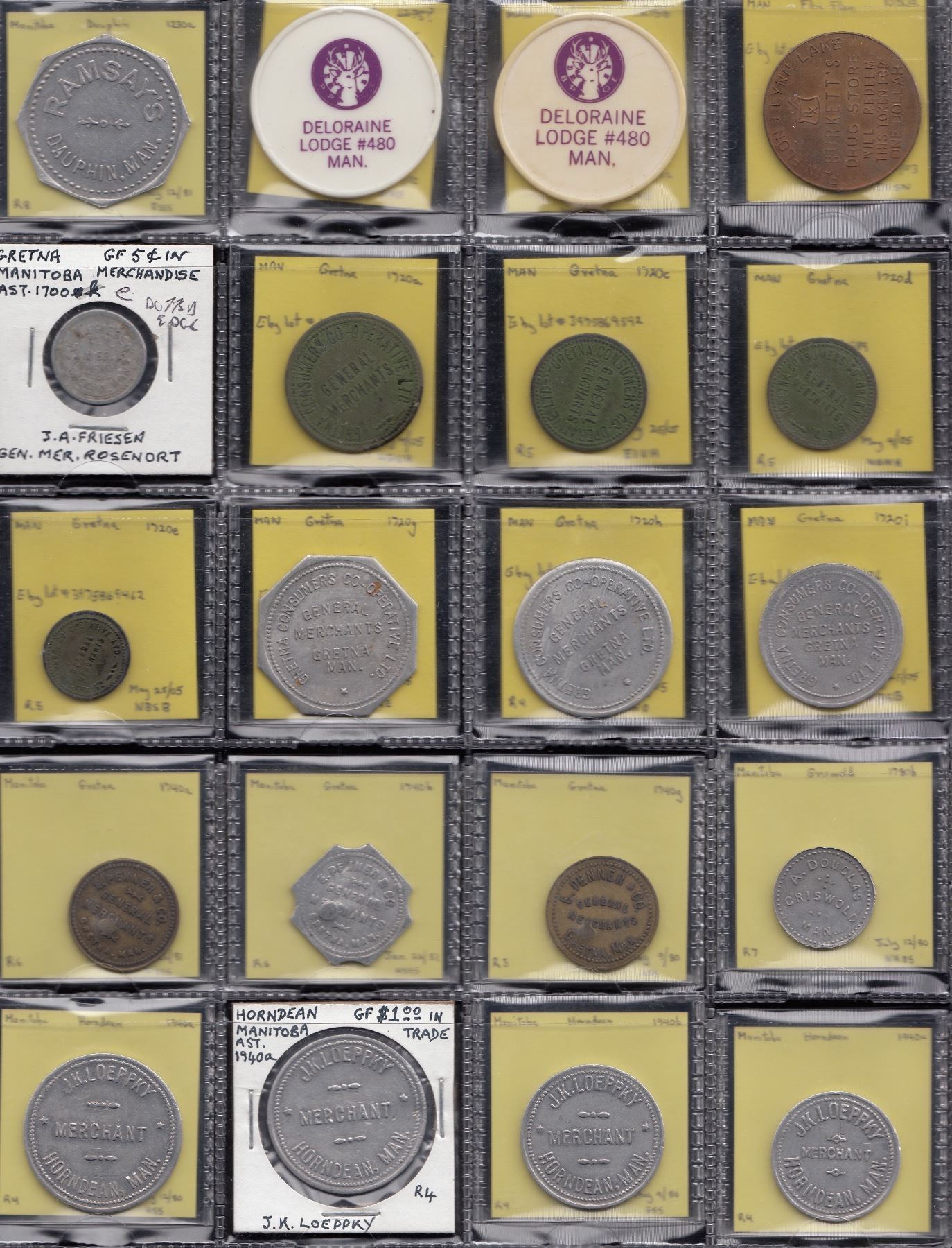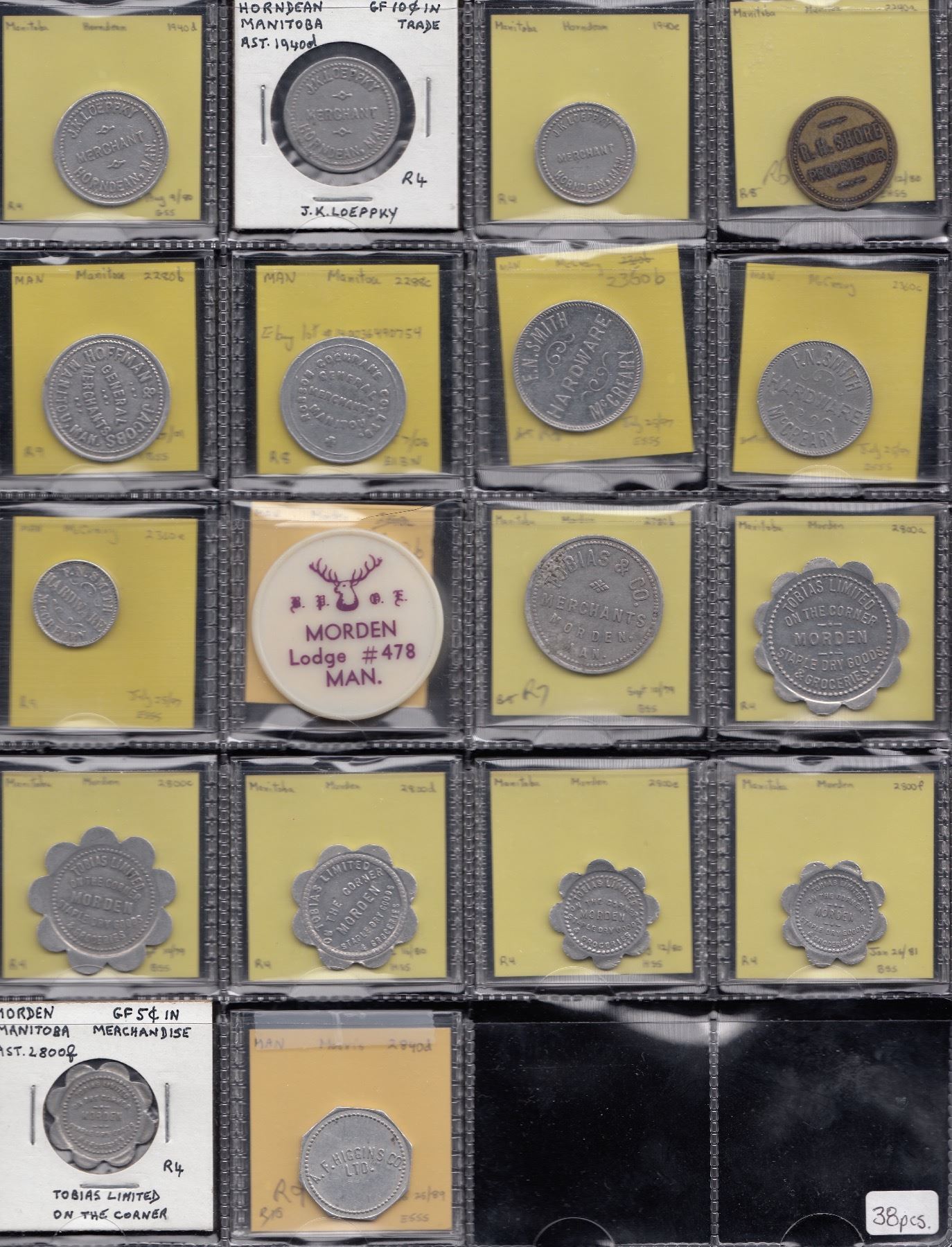 Dauphin, Ramsey’s 1230a; Deloraine, Elk Lodge #480, 1275a & b (plastic); Flin Flon, Burkett’s 1380a (c/s3); Gretna, J.A. Friesen 1700e (dotted edge); Gretna Consumers Co-Op. 1720a, c, d, e & 1720g, h, & i; E. Penner 1740a, b, & g (all with punch mark); Griswold, A. Douglas 1780b; Horndean, J.K. Loeppky 1940a (2), b, c, d (2) & e; Manitou, R.H. Shore 2240a; Hoffman & Jacobs 2280b (R9); Robson Cochrane Co. 2288c (R8); McCreary, F.N. Smith 2360b, c (R9), & e (R9); Morden, Elk Lodge #478, 2690b; Tobias & Co. 2780b; Tobias Limited 2800a, c, d, e, f (2); Morris, A.F. Higgins Co. 2840d (R9). Fine - EF. 38 Pcs.