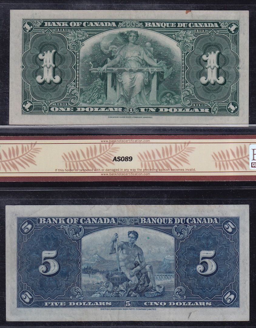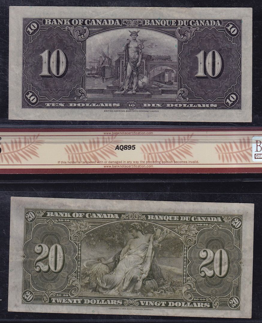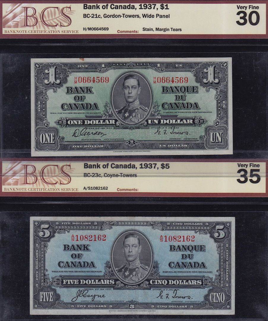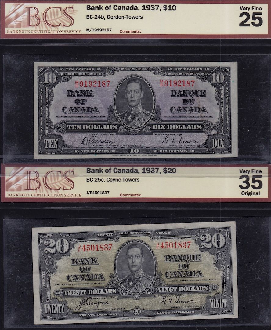 Lot of 4 1937 Bank of Canada Banknotes - Includes: CH BC-21c, BCS VF-30, Stain, Margin Tears, S/N:H/M0664569; CH BC-23c, BCS VF-35, S/N:A/S1082162; CH BC-24b, BCS VF-25, S/N:M/D9192187; CH BC-25c, BCS VF-35 Original, S/N:J/E4501837. 4 Pcs.