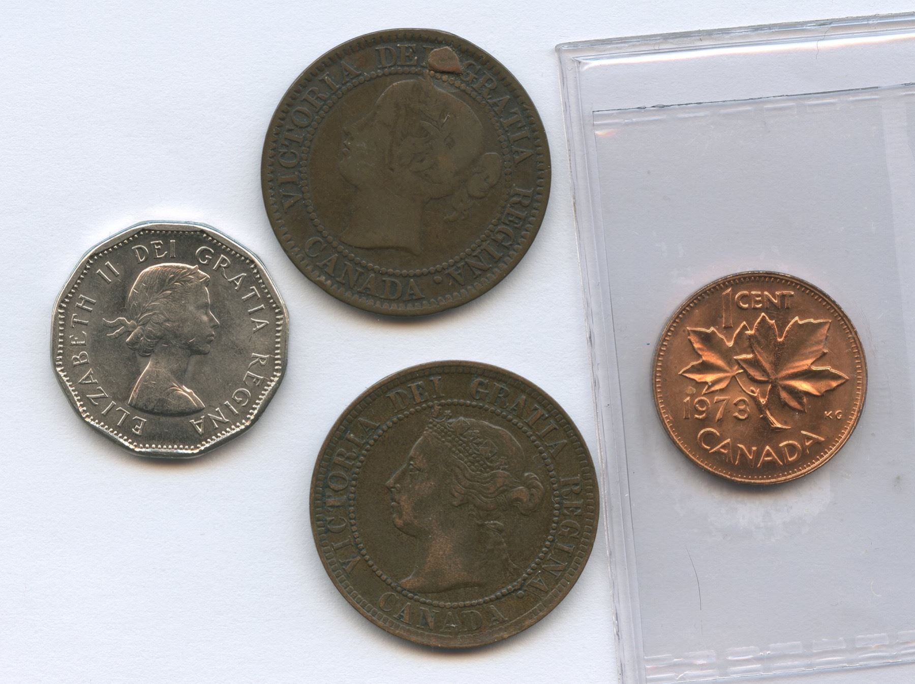 Includes: 1859 One Cent, 9/8 (VG, repaired hole). 1894 One Cent, thick 4 (VF). 1973 One Cent, planchet flaw, ICCS MS-65, Red. 1962 Five Cents, double dated. 4 pcs.
