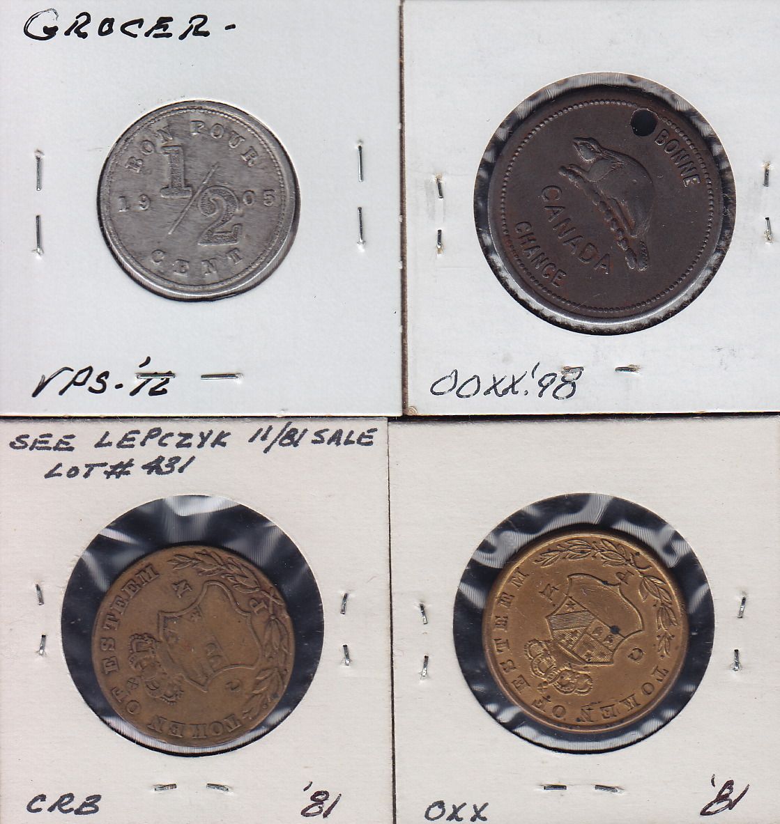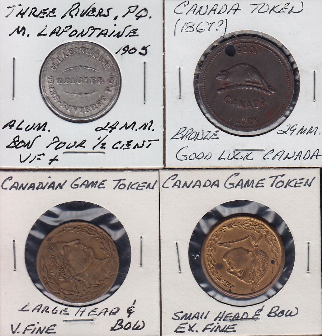 Lot of 4 Canada Gaming and Trade Tokens. Includes: Small bust and bow, brass, EF, Large bust and bow, brass, VF, Good Luck Beaver, holed at top, copper, VF, M. Lafontaine, Three Rivers, PQ, 1/2 cent, Al, VF, 1905. 4 Pcs.