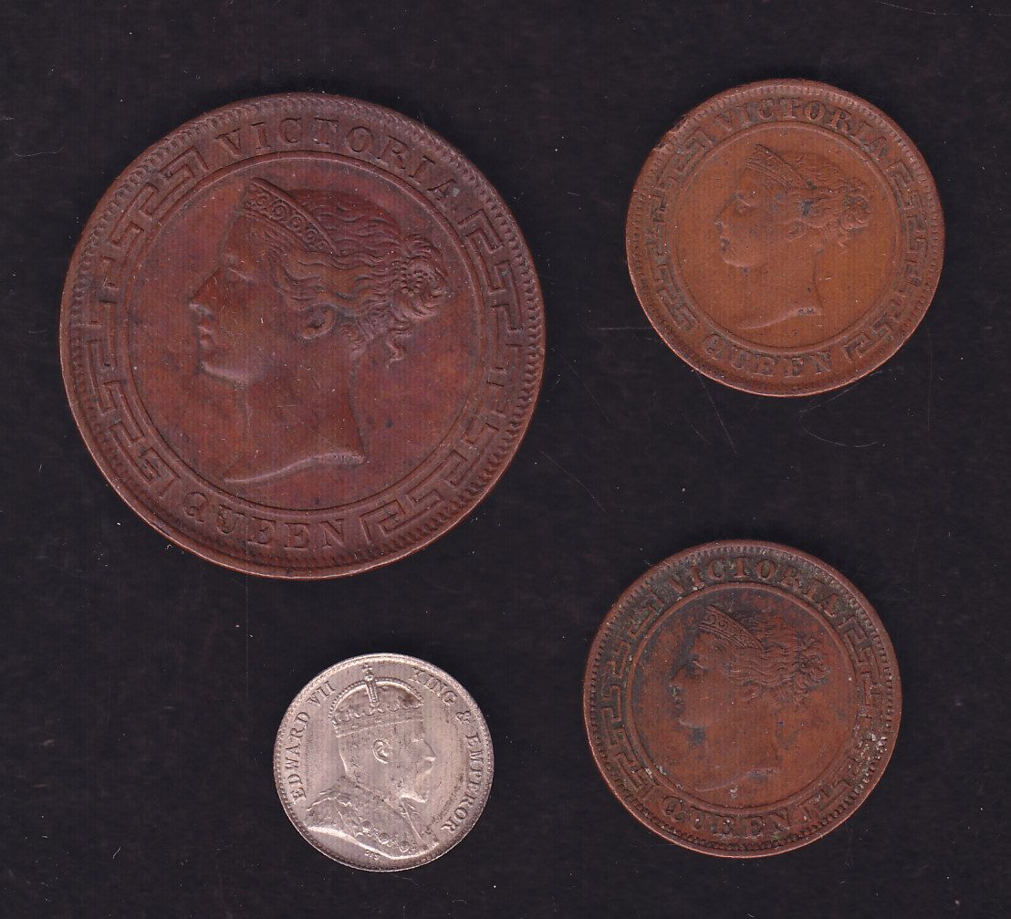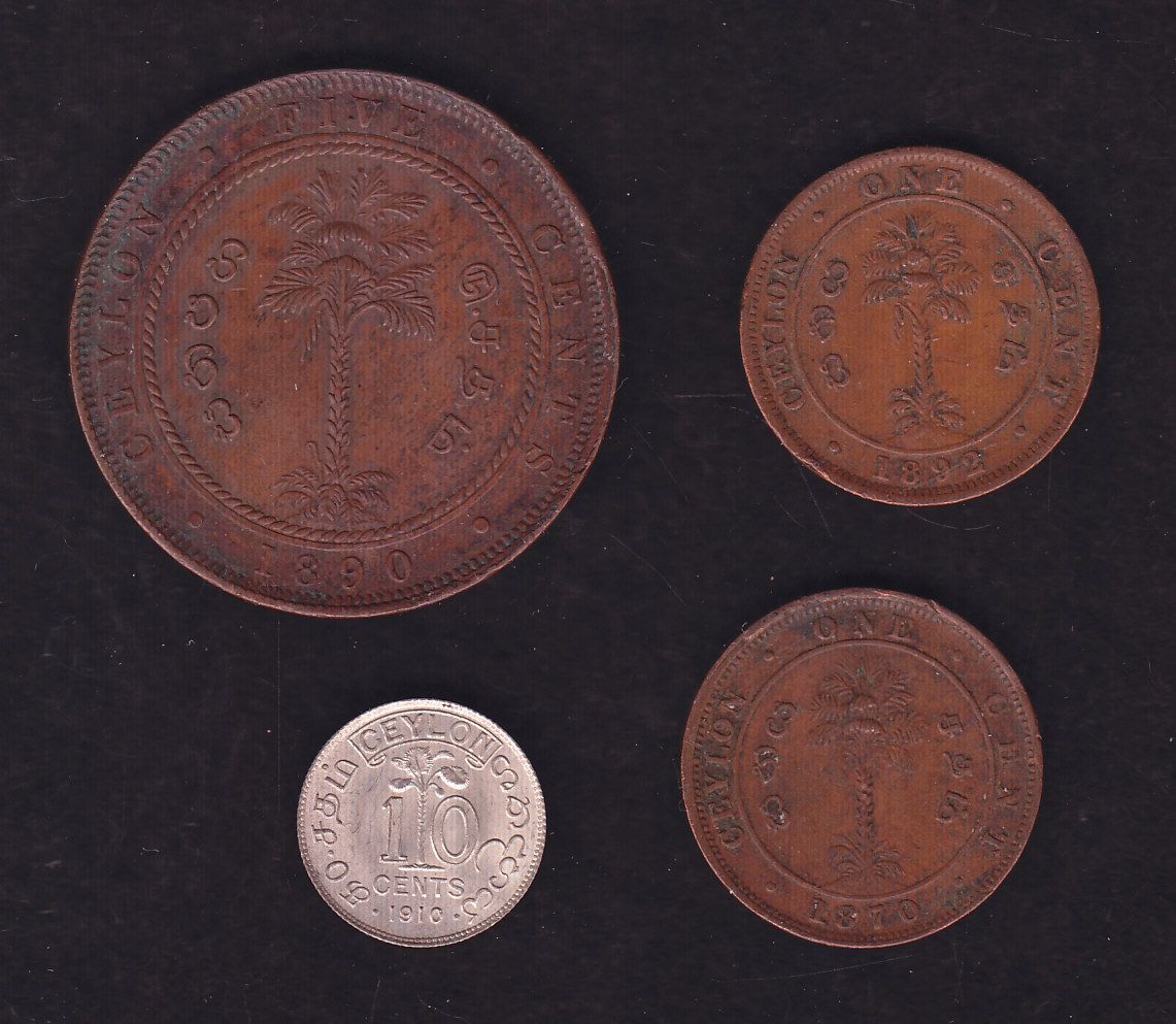 Lot of 4 Ceylon Coins - Includes: 1870 One Cent Fine; 1892 One Cent Fine; 1890 Five Cent VF; 1910 Ten Cent BU. 4 Pcs.