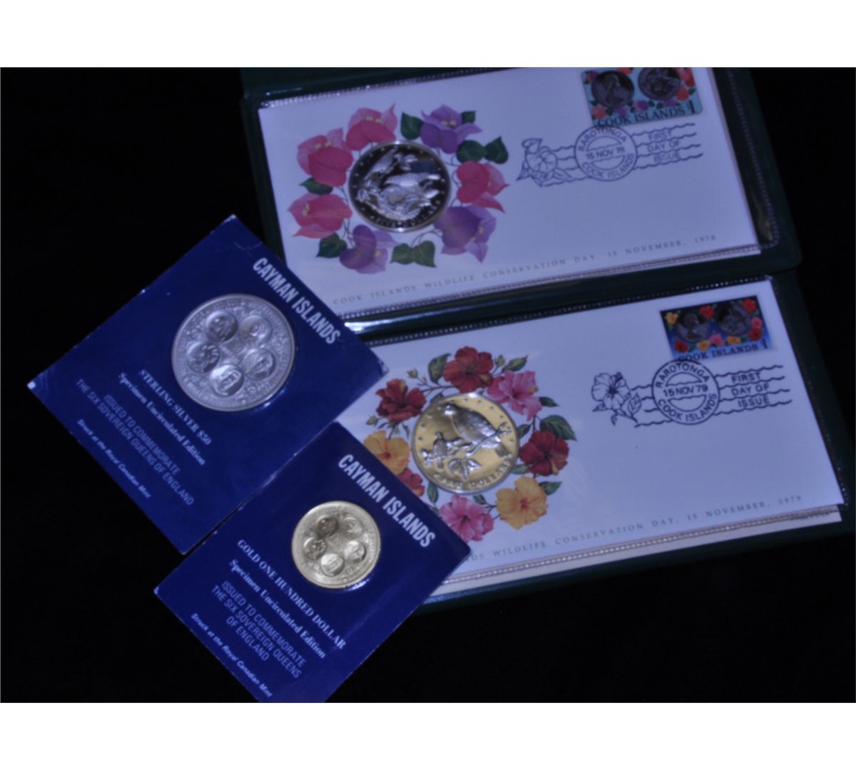 Lot of 4 Commemorative Cayman Islands. Includes: Coin & Stamp First Day Cover $5 Silver 1978 & 1979; 1975 $50 Sterling Silver 6 Sovereign Queens of England Specimen; 1975 $100 Gold 6 Sovereign Queens of England Specimen, .3646agw. 4 Pcs.