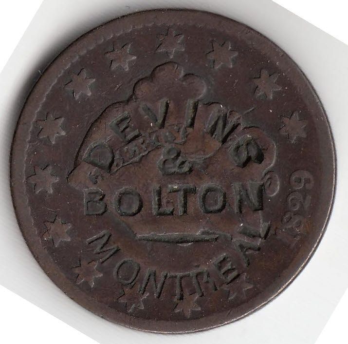 Lot of 4 Devins & Bolton Countermarked USA Large Cents. Includes: D&B (Sm2) countermark on the obverse of a 1829 US large cent. D&B (Sm3) countermark on the obverse of a 1837 US large cent. D&B (Sm3) countermark on the obverse of a holed 1838 US large cent. T N countermark on obverse and reverse with a D&B (Sm3) countermark on the obverse of a 1838 US large cent. Countermarks F-VF. 4 Pcs.