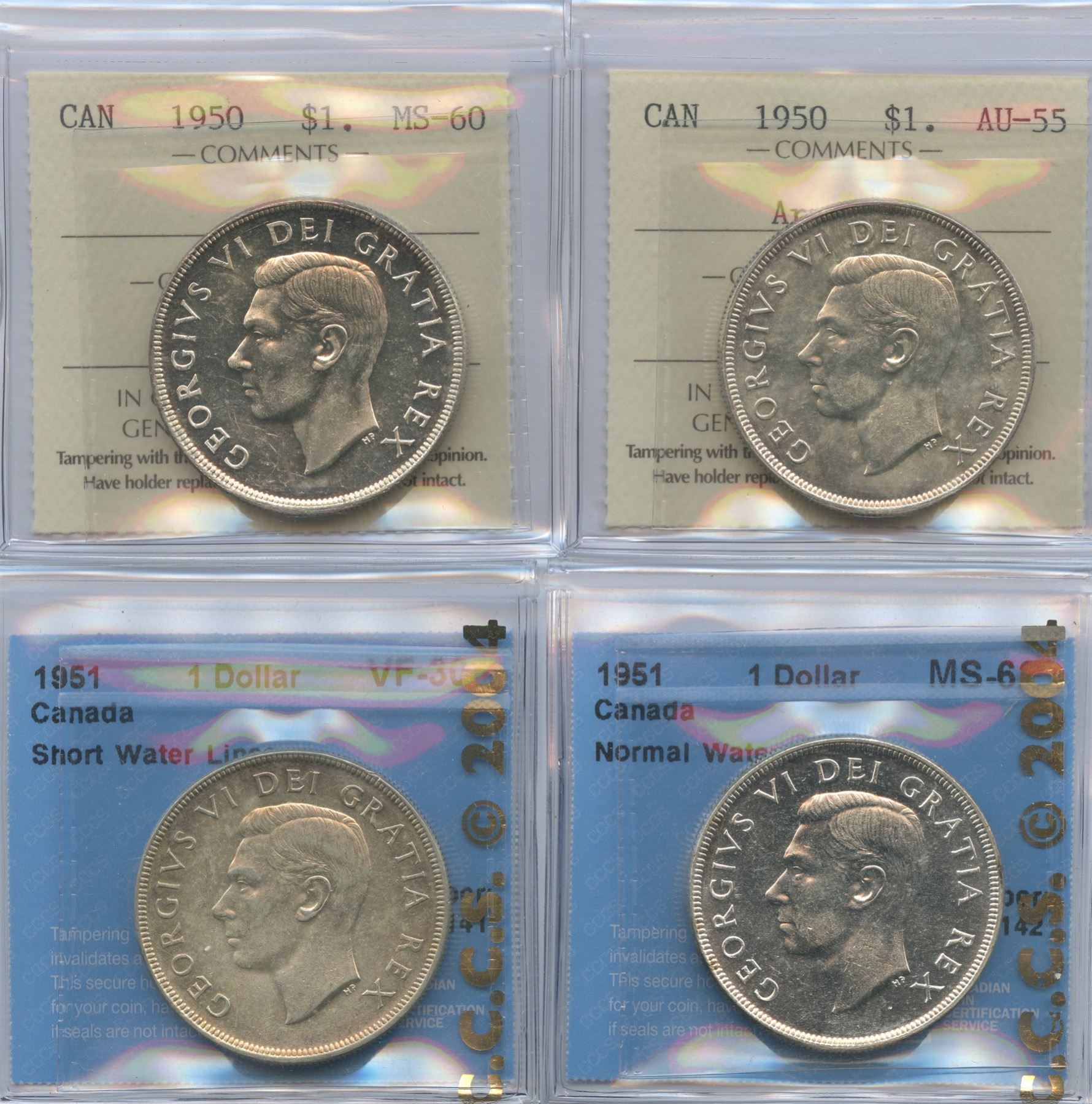 Includes: 1950 ICCS MS-60. 1950 AU-55, arnprior. 1951 CCCS VF30 SWL. 1951 CCCS MS-62. 4 pcs.