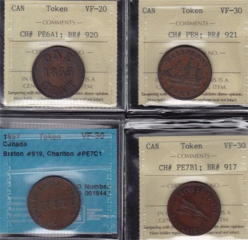 Lot of 4 Graded Tokens - Lot includes: BR 917, CH PE-7B1, ICCS VF-30; BR 919, CH PE-7C1, 1857, CCCS VF-30; BR 920, CH PE-6A1, ICCS VF-20; BR 921 CH PE-8, ICCS VF-30. 4 Pcs.