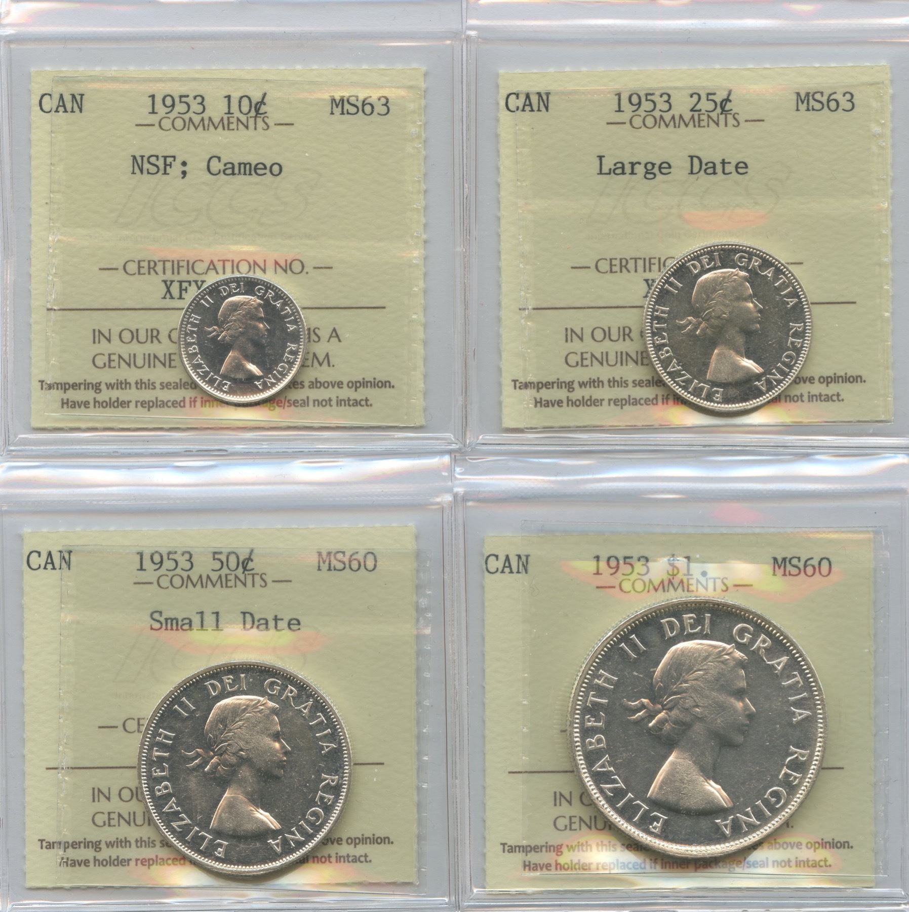 Includes: Ten Cents MS63, NSF; cameo. Twenty-Five Cents MS63, large date. Fifty Cents MS60, small date. Silver Dollar MS60, NSF. 4 Pcs.