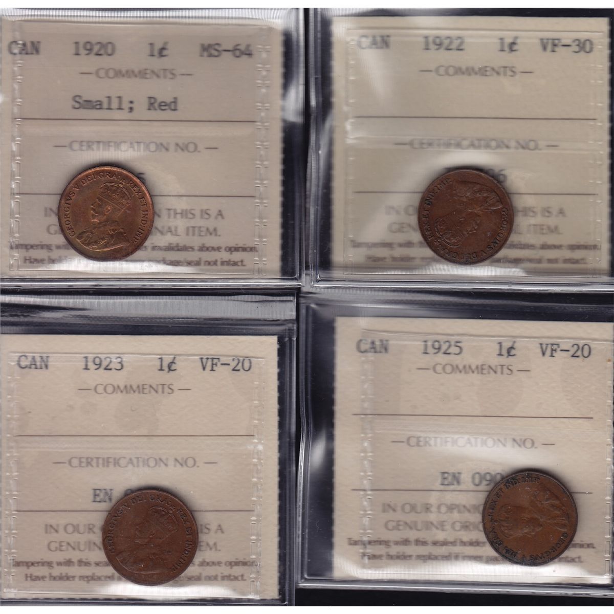 Lot of 4 ICCS graded small One Cents - 1920 MS-64 Small, Red; 1922 VF-30; 1923 VF-20; 1925 VF-20. 4 Pcs.