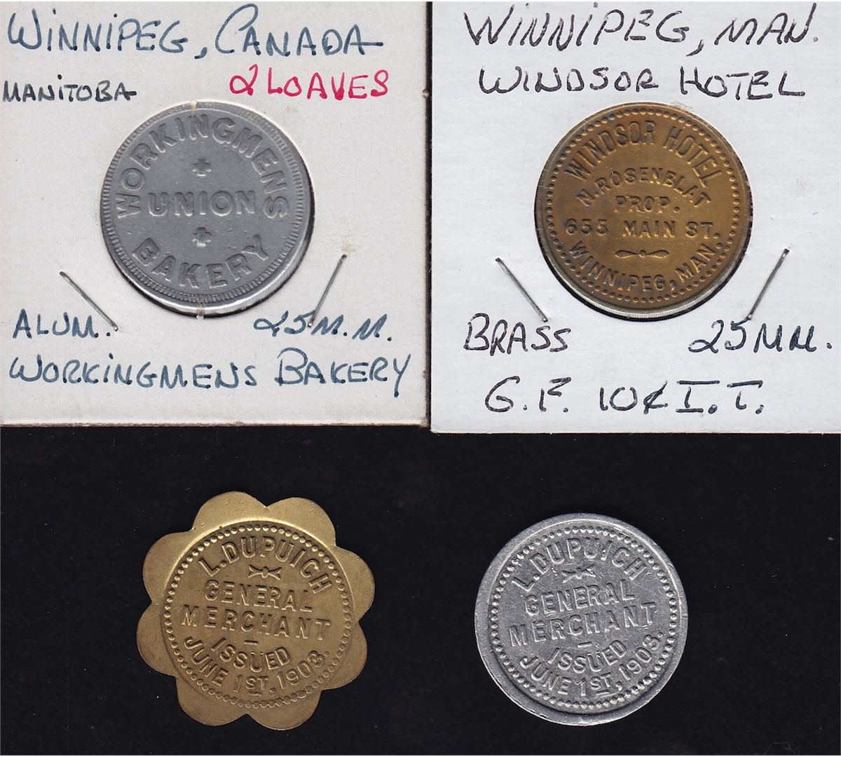Lot of 4 Manitoba Trade Tokens. Includes: Windsor Hotel, Winnipeg, MB, 10 cents, brass, EF, Workingman's Bakery, Winnipeg, MB, 2 loaves, VG, aluminum, L. Dupvich, Woodridge, MB, 10 cents, aluminum, and $5.00, brass, VF. 4 Pcs.