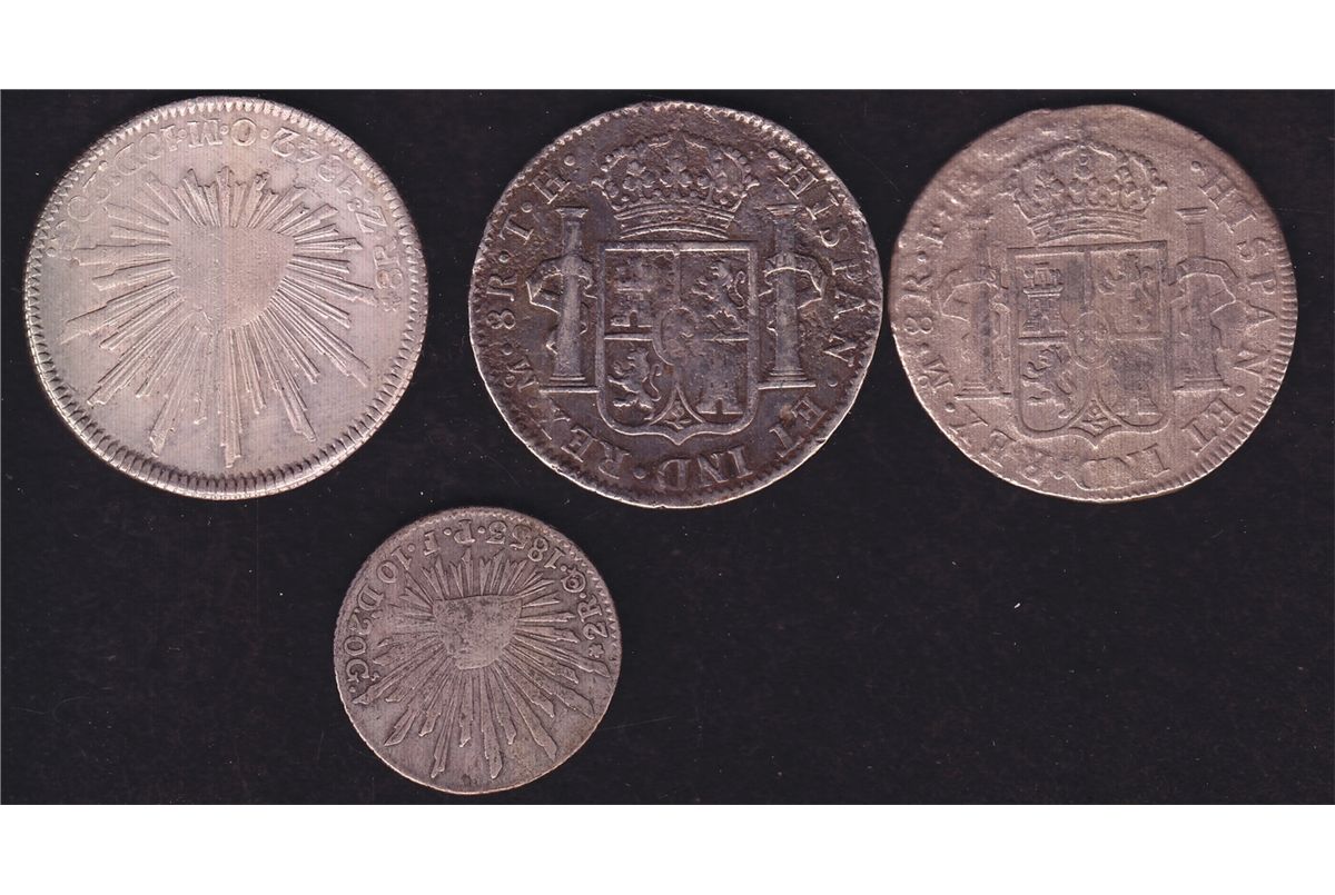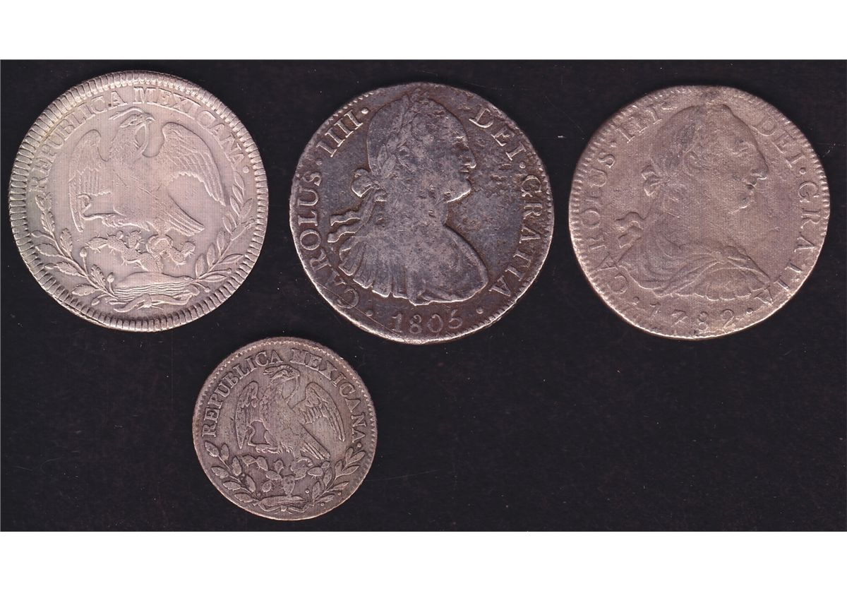 Lot of 4 Mexican Silver Coins - Includes: 1853 2 Reales; 1782, 1805, 1842 8 Reales. 4 Pcs.