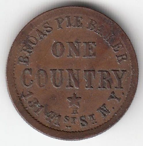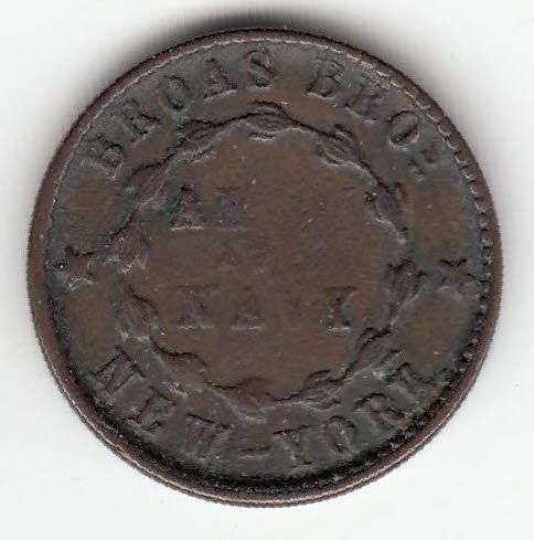 Lot of 4 NY, NY Civil War Tokens. Includes: 630L-4a, Broas Bros., R2, F. 630M-1a, Broas Pie Baker, R2, F/VF. 630M-6ao, Broas Pie Baker, R3, Broken obv. Die, VF. 630M-9a, Broas Pie Baker, R5, Broken Dies, VF.