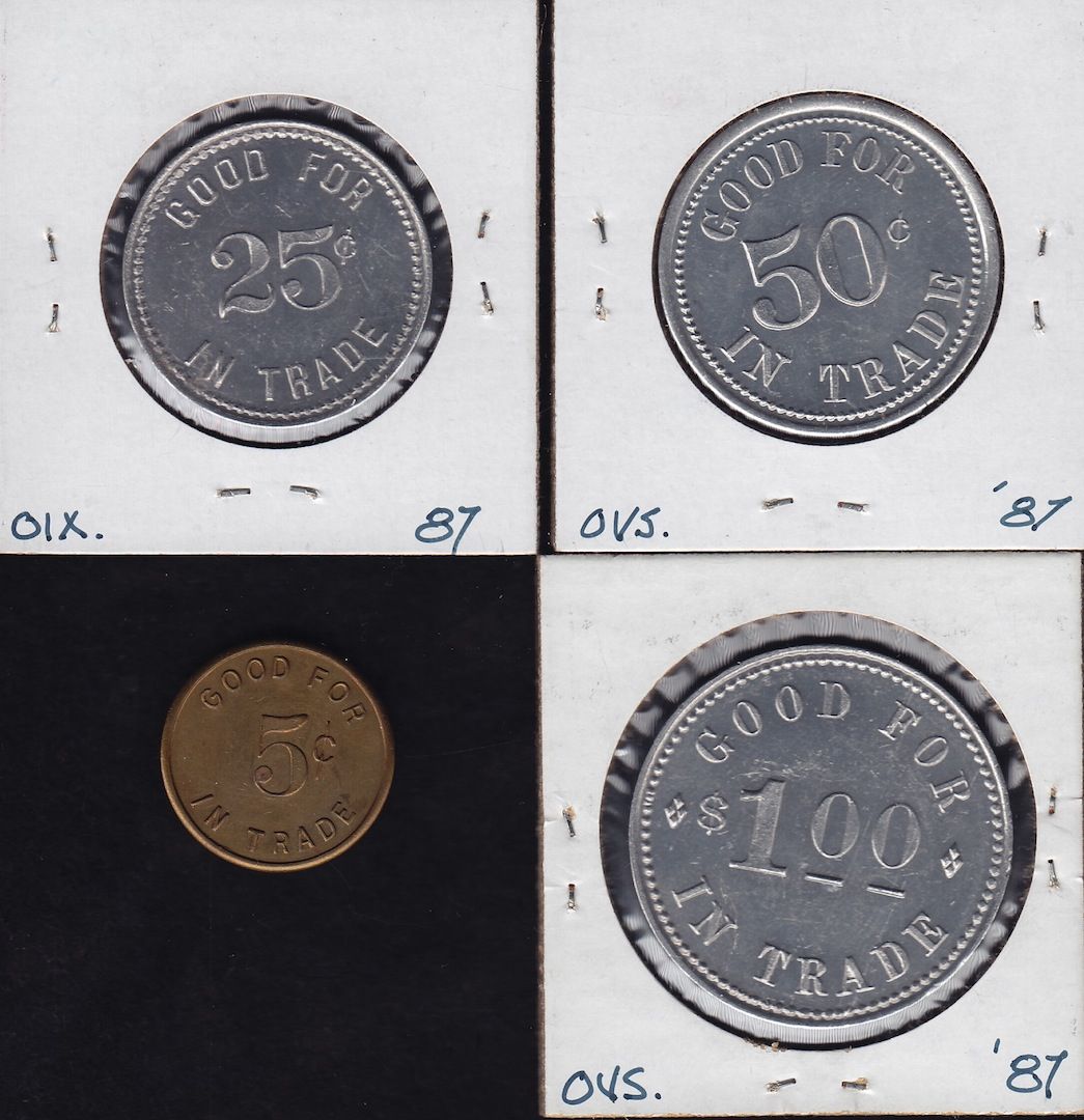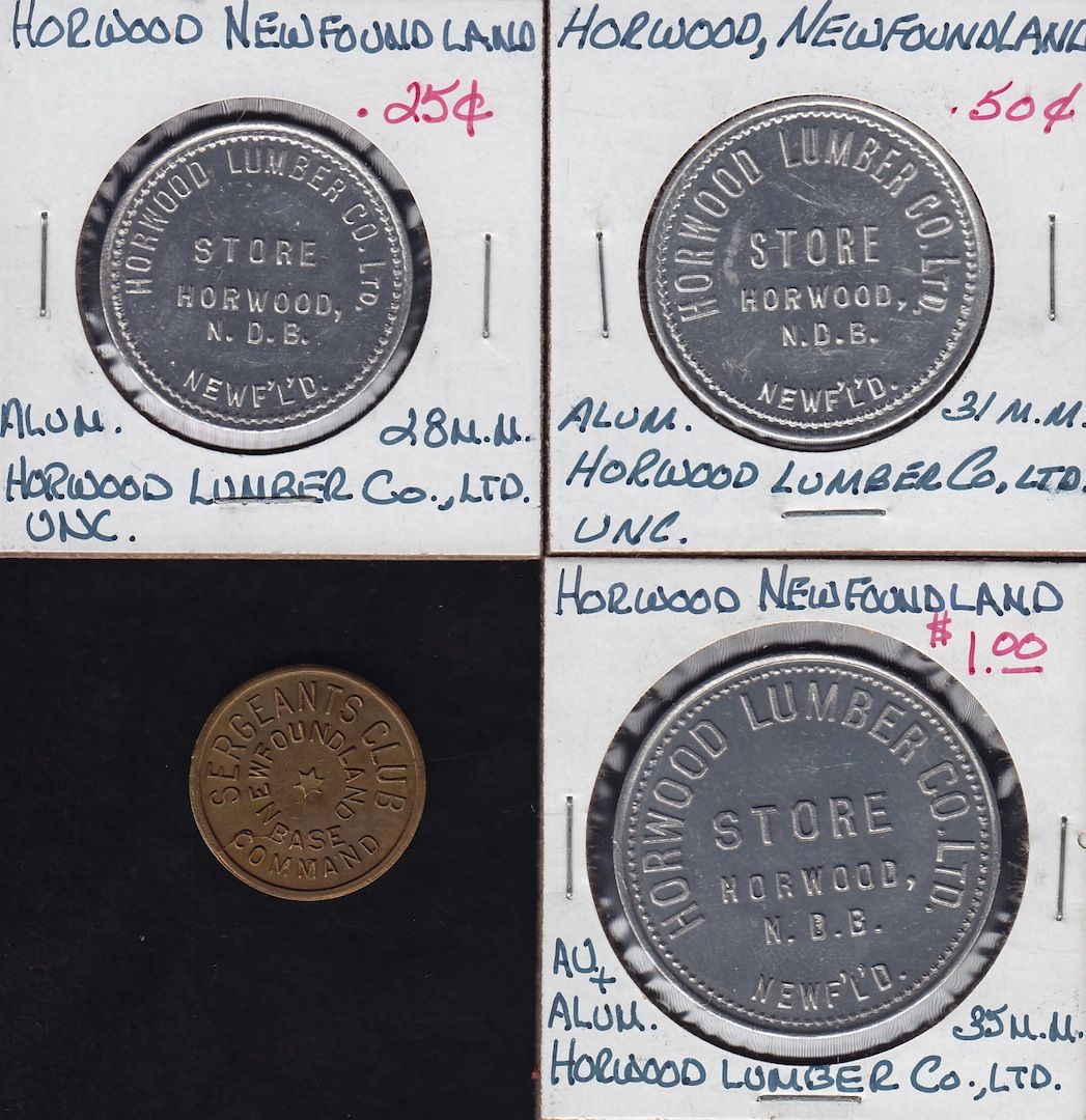 Lot of 4 Newfoundland Trade Tokens. Base Command Sergeants Mess, Newfoundland, brass, 5 cents, AU, Horwood Lumber Co, Horwood, NF, 5, 50 and $1.00, UNC, aluminum. 4 Pcs.