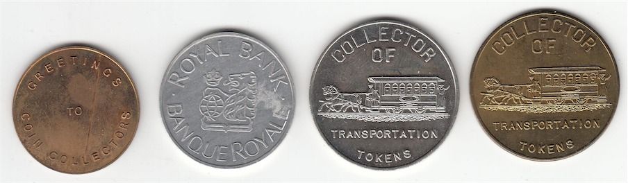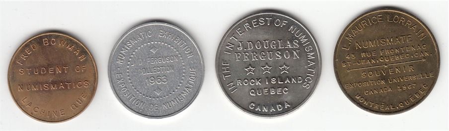 Lot of 4 Numismatist Cards. Includes: Fred Bowman/ Student of Numismatics/ Lachine Que. Brass, 29.5mm, Unc., Royal Bank Numismatic Exhibition/ J D Ferguson/ Collection/ 1963. Aluminum, 32mm, EF., In the Interest of Numismatics/ J. Douglas/ Ferguson/ Rock Island/ Quebec/ Canada. Rev: Collector/ of/ (Rail car pulled by horses)/ Transportation/ Tokens. WM, 35mm, Unc., L. Maurice Lorrain/ Numismate/ 43 Rue Frontenac/ St - Jean, Quebec, Can./ Souvenir/ Exposition Universelle/ Canada 1967/ Montreal, Quebec. Rev: Collector/ of/ (Rail car pulled by horses)/ Transportation/ Tokens. Brass, 35mm, Unc. 4 Pcs.