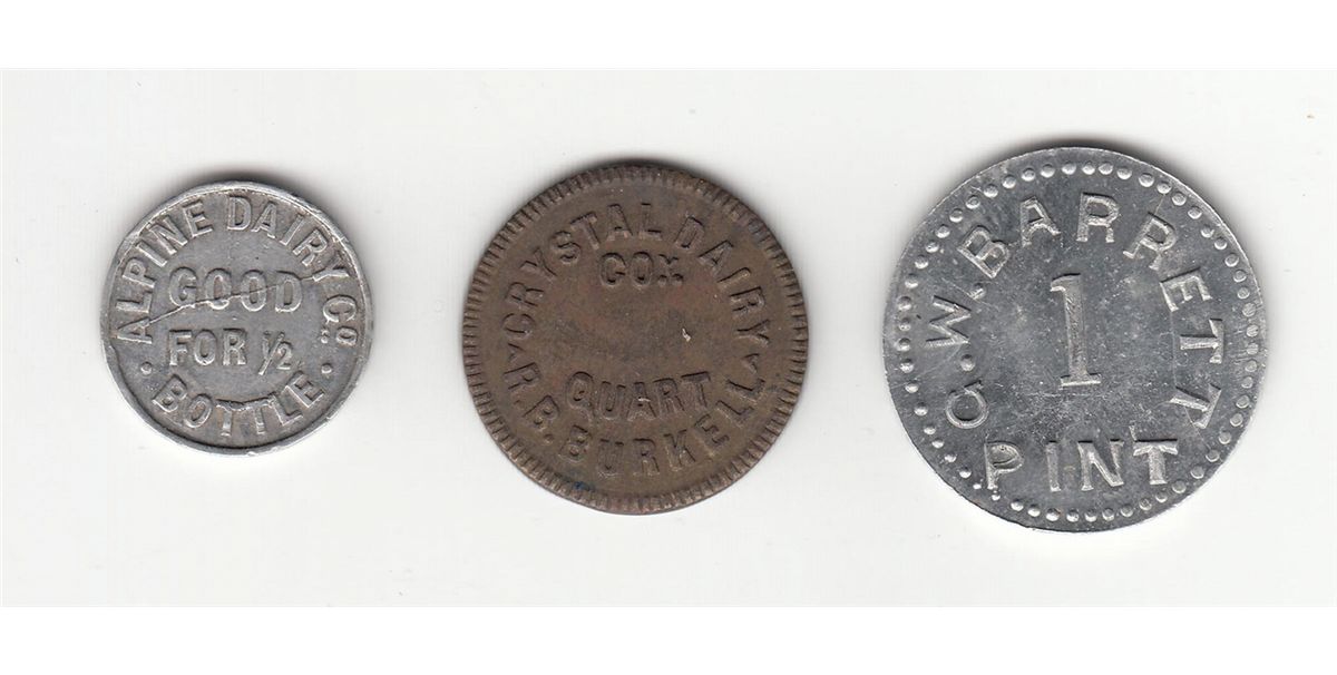 Lot of 4 Ontario Milk Tokens. Includes: Ler 1067a, Alpine Dairy (Toronto) Good for 1/2 Bottle. Ler 1068n, Brass, Crystal Dairy B. Burkell (Toronto) Quart. Copper, Crystal Dairy B. Burkell (Toronto) 1/2 Quart, Rev: WH Banfield. Ler 1067m G.W. Barrett 1 Pint Leitrim, Ont. EF to Unc. 4 Pcs.