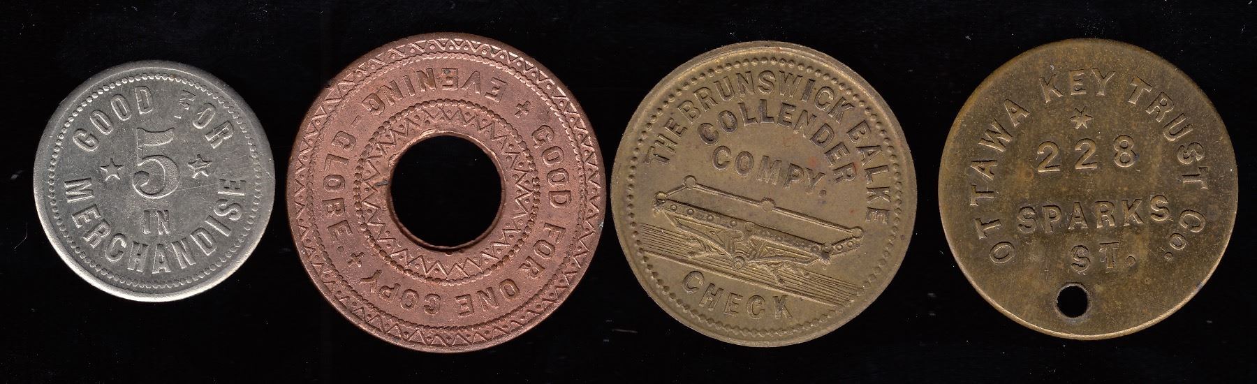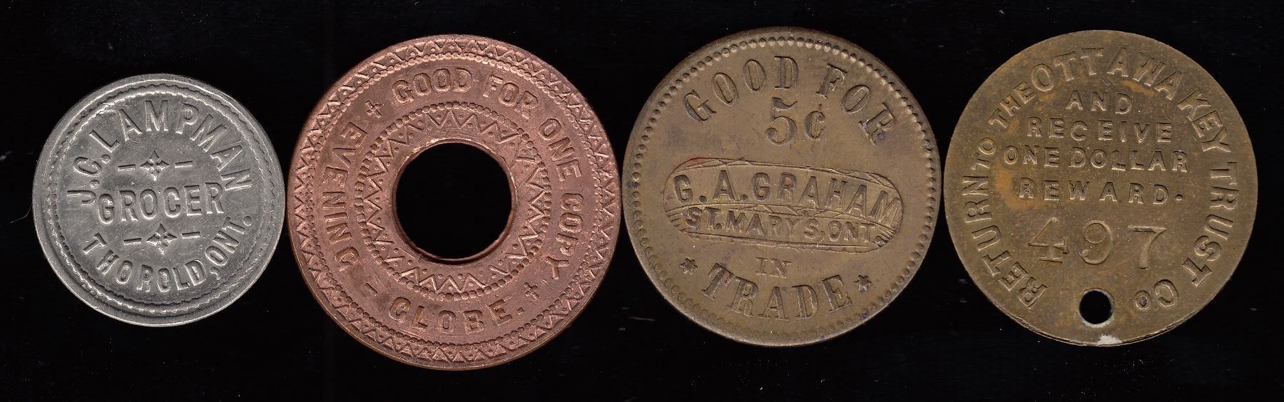 Br. 733, Ottawa Key Trust, brass, BU; Br. 754, G.A. Graham, 5?, brass, AU; Br. 755, Evening Globe, BU w. perfect copper gilt; Br. 756, J.C. Lampman, 5?, German silver, BU. 4 Pcs.