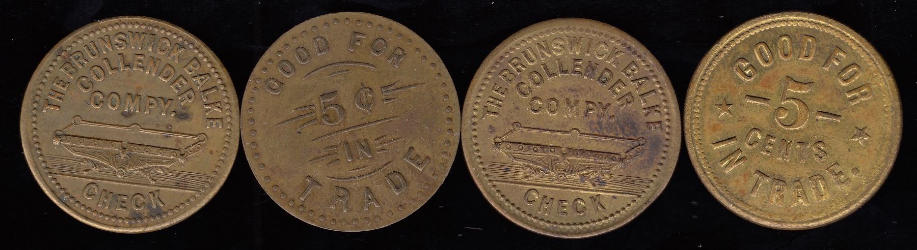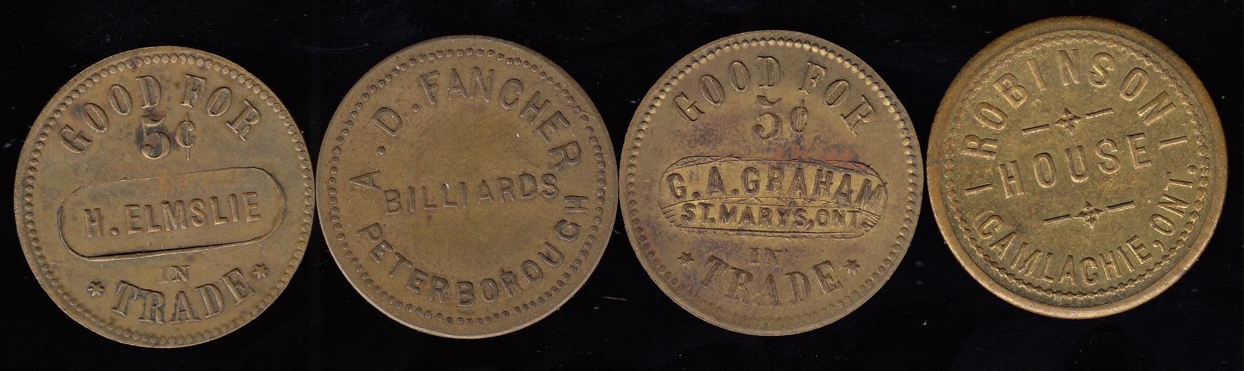 Br. 752, H. Elmslie, 5?, brass, EF; Br. 753, A.D. Fancher, 5?, brass, Unc; Br. 754, G.A. Graham, 5?, brass, Unc lustre; Br. 761a, Robinson House, 5 / Cents / In Trade, brass, BU. 4 Pcs.