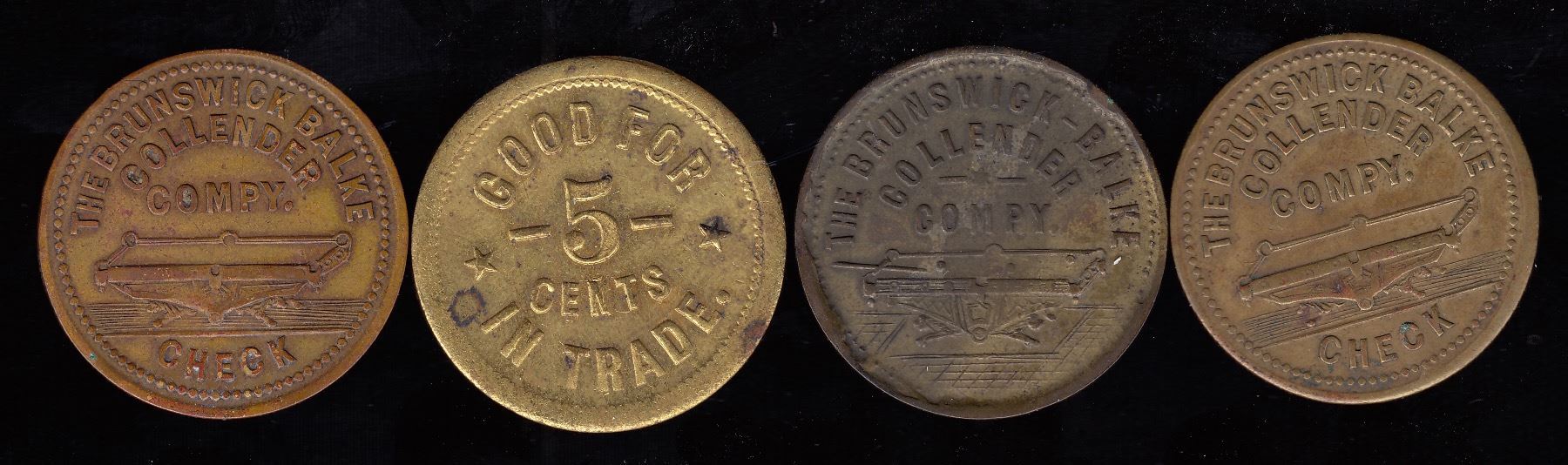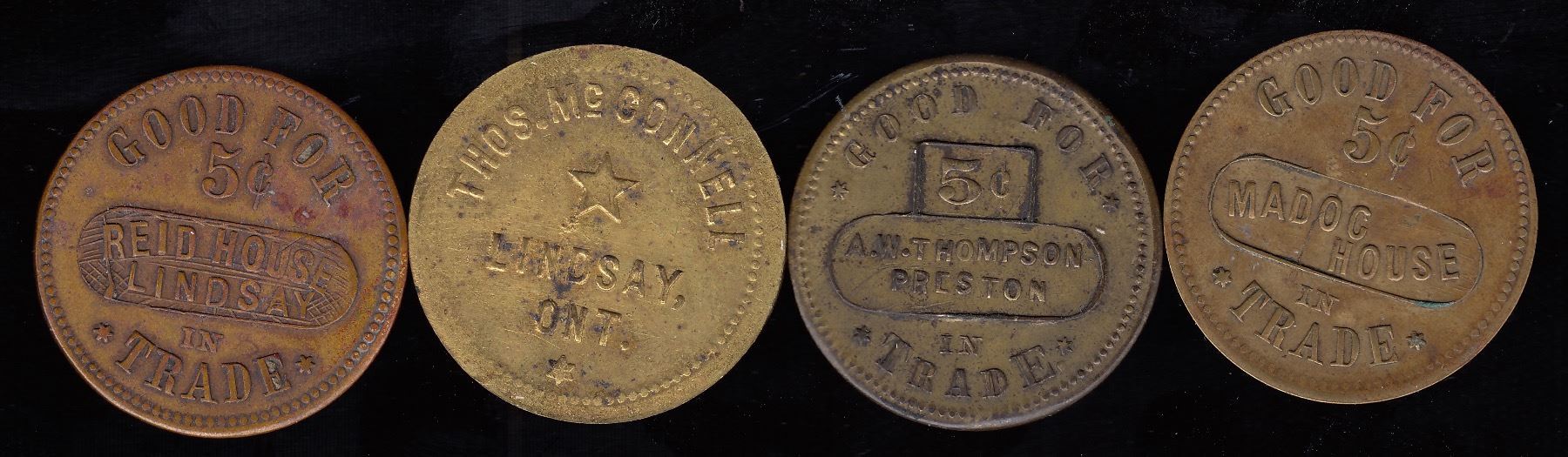 Br. 763, Reid House, 5?, brass, AU; Br. 764, Thos. McConnell, 5 cents, brass, BU; Br. 766, A.W. Thompson, 5?, brass, AU; Br. 767, Madoc House, 5?, brass, EF. 4 Pcs., the third and the last scarce.
