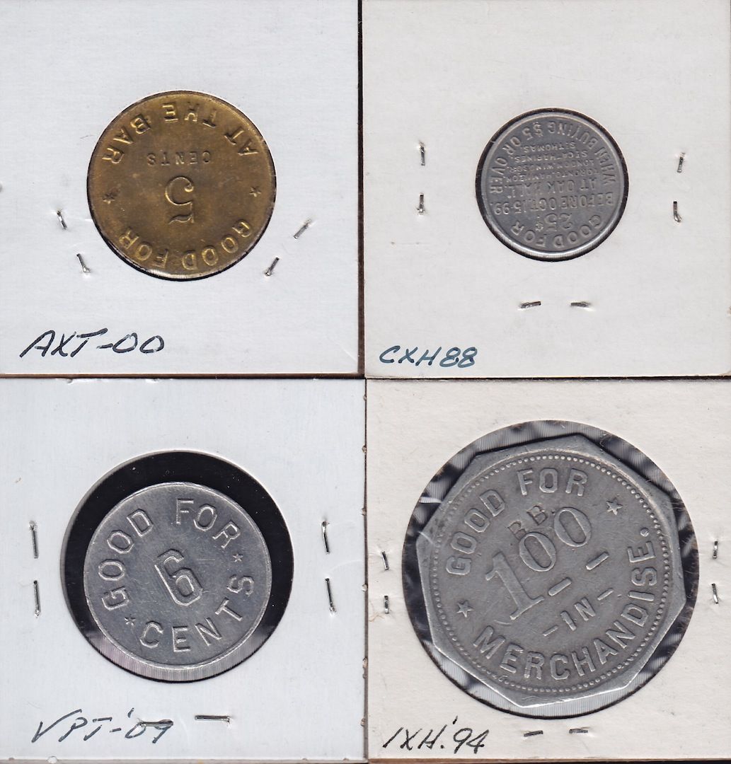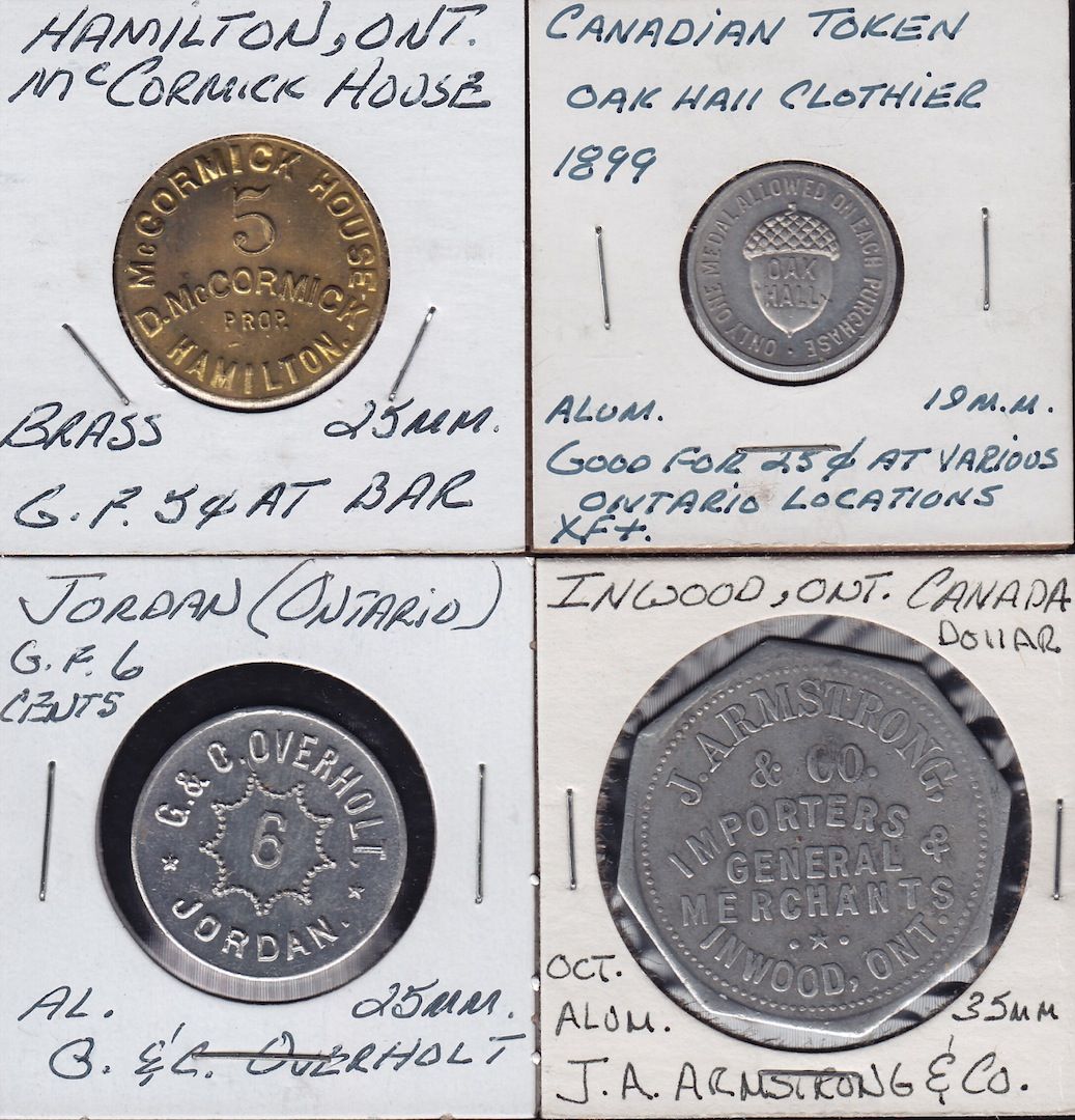Lot of 4 Ontario Trade Tokens. Oak Hall Clothier, Hamilton, ON, 25 cents, aluminum, EF, McCormick House, Hamilton, ON, 5 cents, brass, UNC, J. Armstrong, Inwood, ON, $100, aluminum, VF, G. & c. Overholt, Jordan, ON, 6 cents, aluminum, UNC. 4 Pcs.