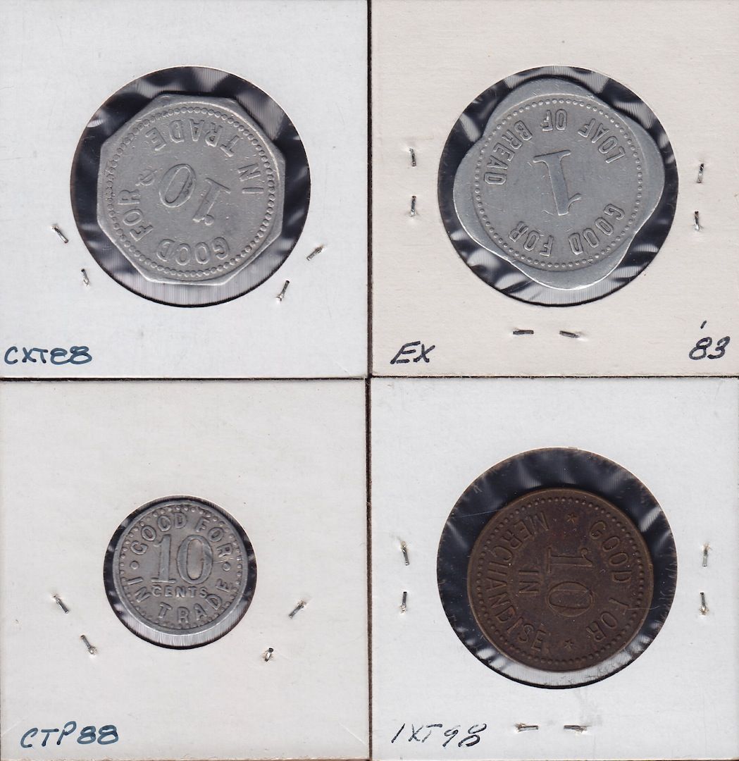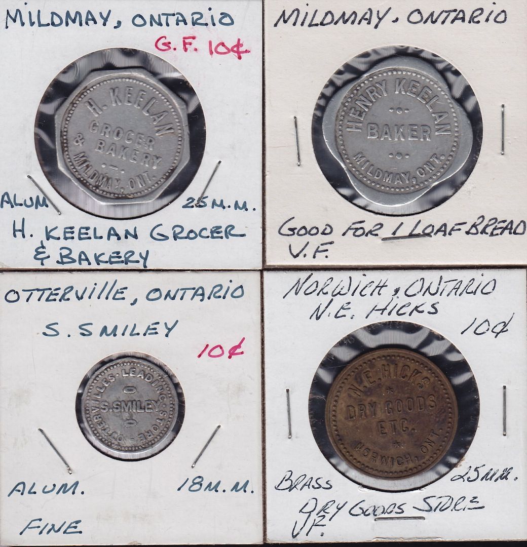 Lot of 4 Ontario Trade Tokens. Henry Keelan, Mildway, ON, 1 loaf, aluminum, VF, H. Keelan, Mildway, ON, 10 cents, aluminum, VF, N.E. Hicks, Norwich, ON, 10 cents, brass, VF, S. Smiley, Otterville, ON, 10 cents, aluminum, VF. 4 Pcs.