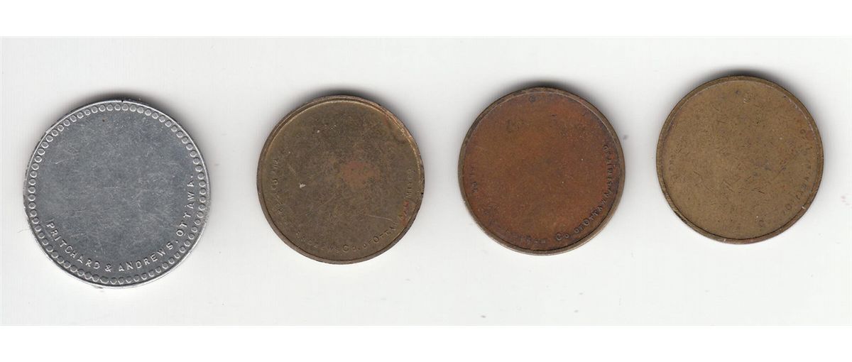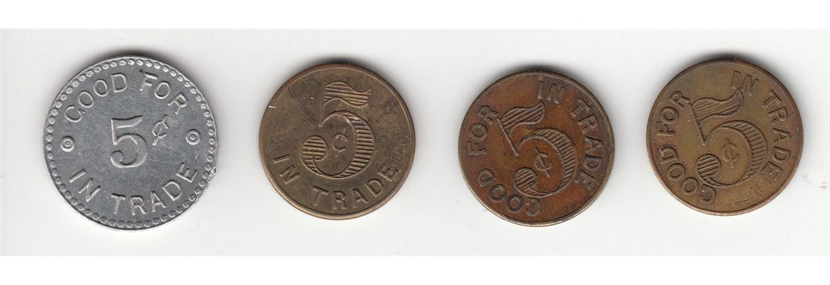 Lot of 4 Pritchard & Andrews Advertising Good For 5¢. Includes: Uniface Good For 5¢ in Trade. Alum, 24mm. Uniface 5¢ in Trade. Brass, 21mm. Uniface Good For 5¢ in Trade, Tip of 5 touches the I of In. Brass, 21mm. Uniface Good For 5¢ in Trade, Tip of 5 touches the N of In. Brass, 21mm. EF. 4 Pcs.
