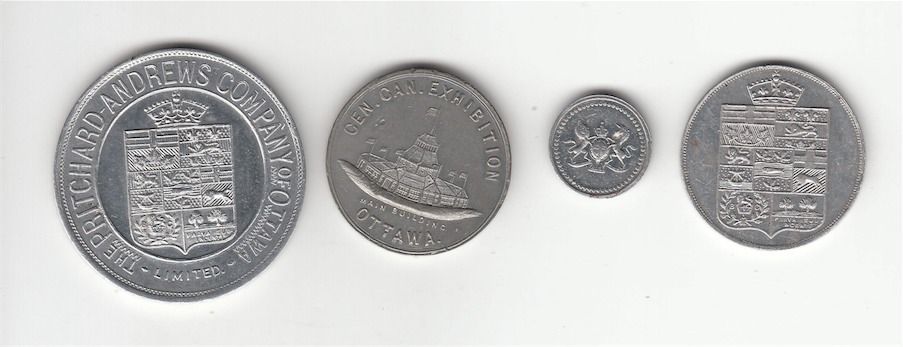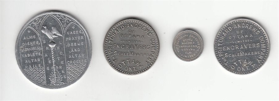 Lot of 4 Pritchard & Andrews Advertising Medals. Includes: Obv as 996m. Rev: Alms Dishes, Memorial Tablets, Altar Rails. Brass Lecterns Vases, Prayer Desks and Altar Crosses. Alum, 38mm. Pritchard-Andrews Company Engravers Scale Makers Ottawa, Ont. Rev: Cen Can. Exhibition Ottawa. WM, 28mm. Pritchard-Andrews Co. Scale Makers Engravers Ottawa Can. Rev: Coat of Arms. Alum, 16mm. Ler 996q, Pritchard-Andrews Company Engravers Scale Makers Ottawa, Ont. Rev: Canada Shield. Alum, 28mm. EF to Unc. 4 Pcs.