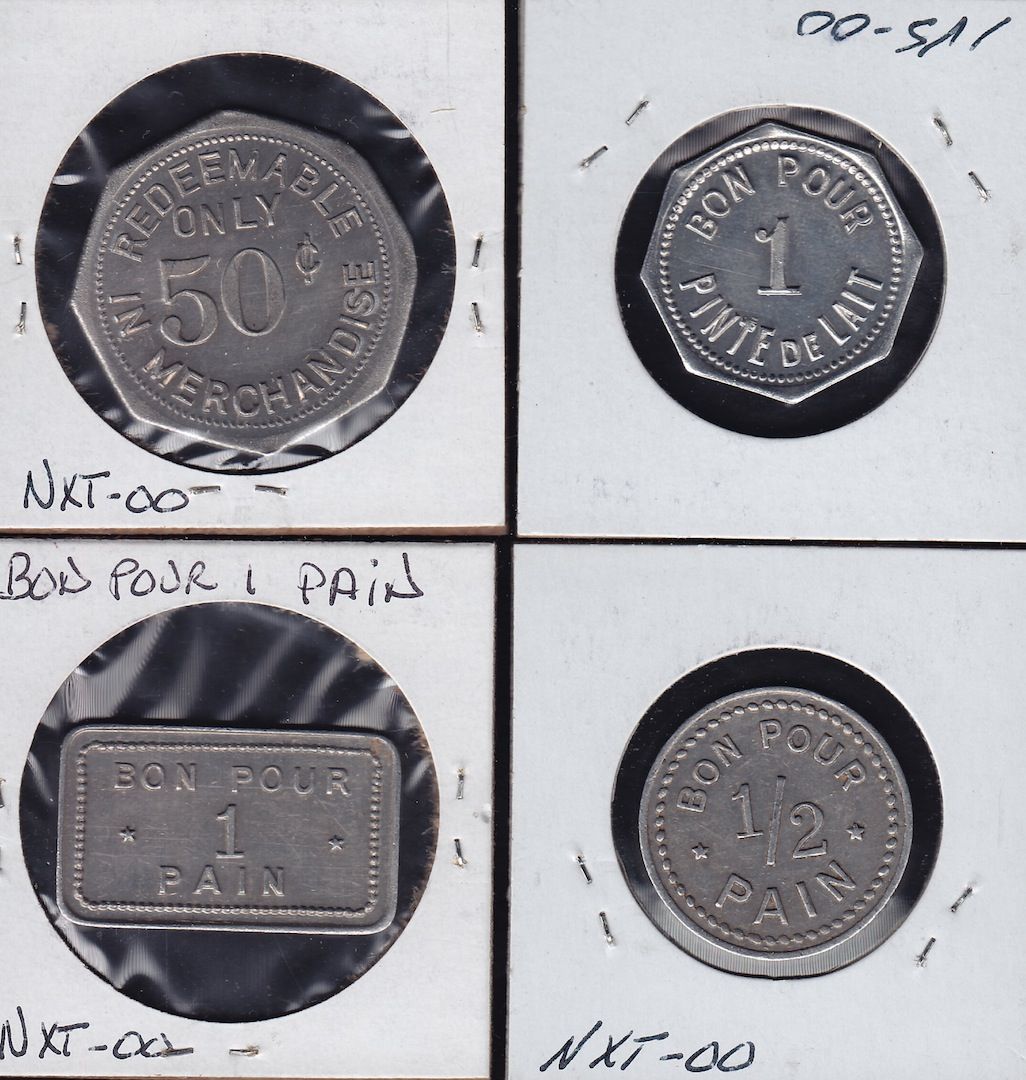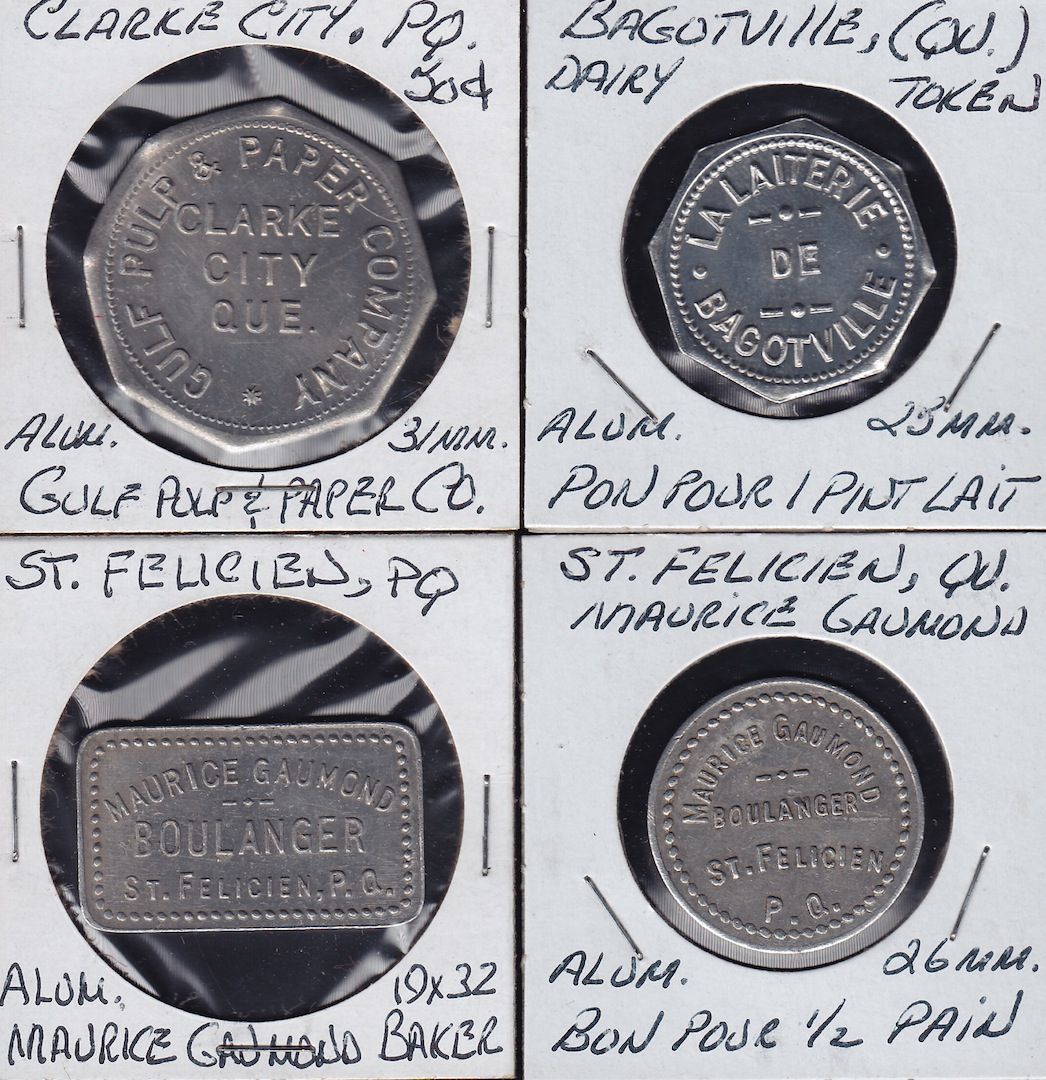 Lot of 4 Quebec Trade Tokens. La Laiterie de Bagotville, Bagotville, PQ, 1 pinte, aluminum, UNC, Gulf Pulp and Paper Co., Clarke City, PQ, 50 cents, aluminum, AU, Maurice Gaumond, St. Felicien, PQ, 1/2 pain, aluminum, AU, Maurice Gaumond, St. Felicien, PQ, 1 pain, aluminum, EF. 4 Pcs.