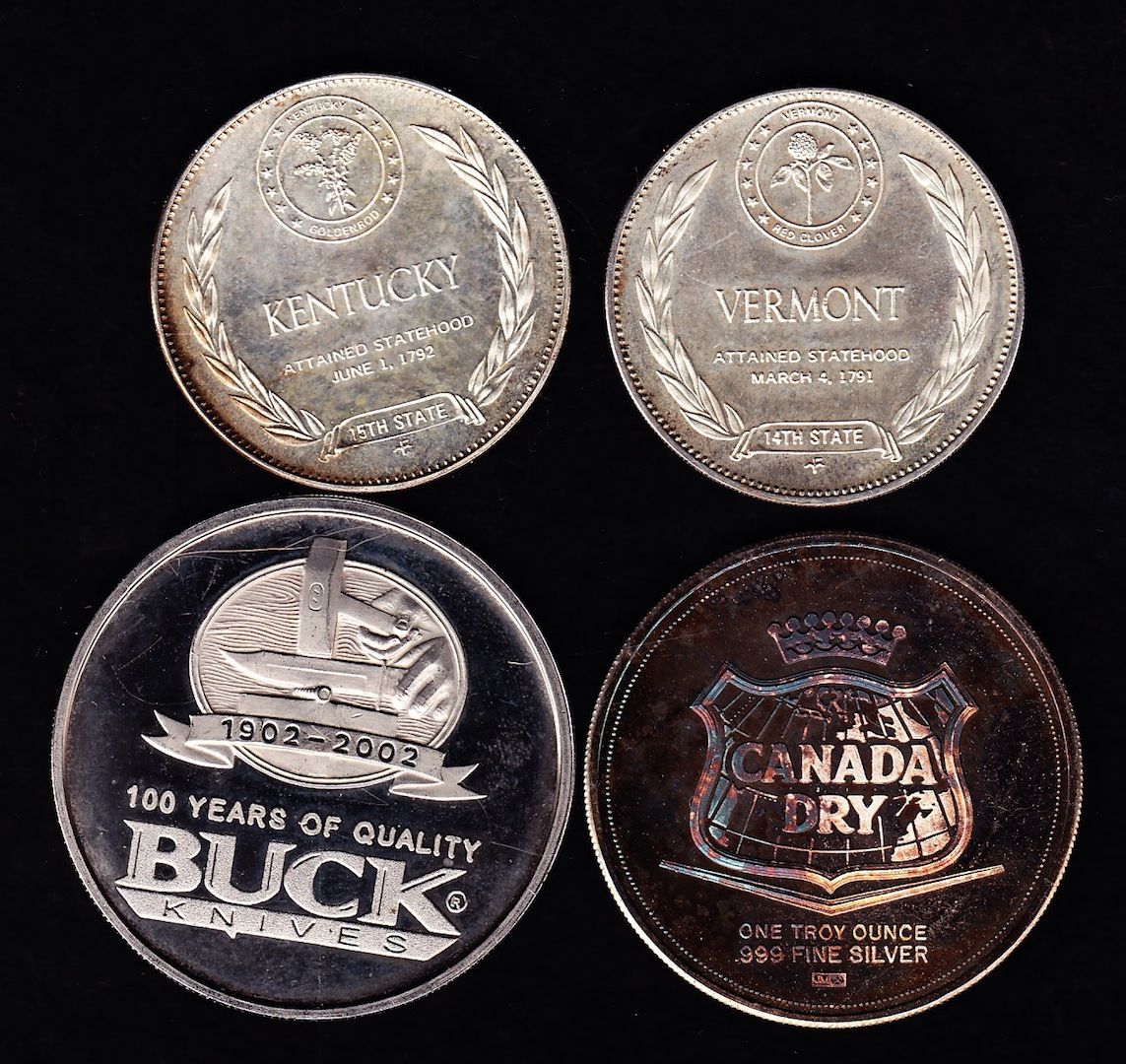 Lot of 4 Silver Medallions - Includes: Buck Knives; Kentucky Statehood; Vermont Statehood, and Canada Dry 1 Onze. 4 Pcs.