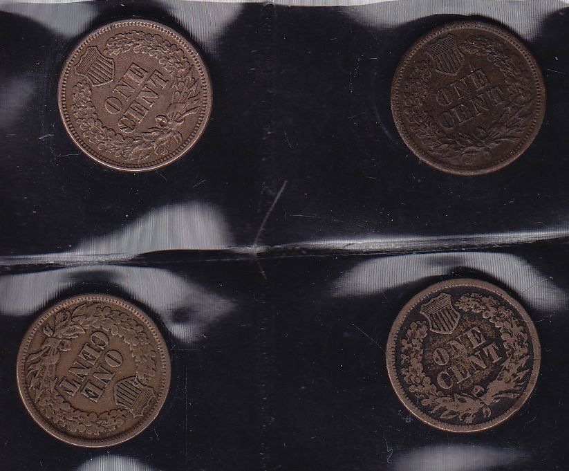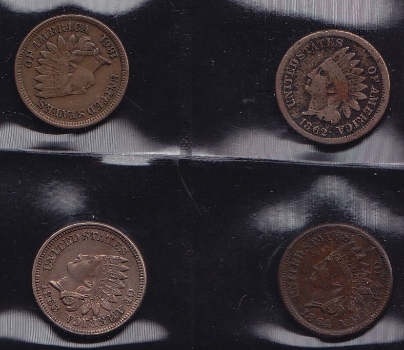 Lot of 4 USA Civil War era Indian Head Pennies. Includes: 1861 VF, 1862 VG, 1863 VF, 1864 (no L) F.