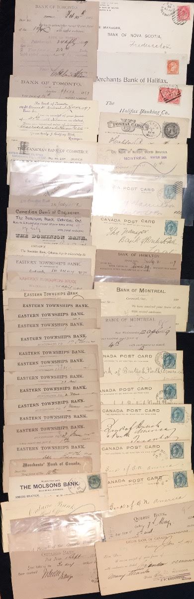 Lot of 48 Chartered Banking Correspondance Postcards - Cool lot with interesting cancelations, includes: Onatrio Bank, Quebec Bank, Molson Bank, Halifax Banking Company, Merchants Bank of Halifax, ect...48 Pcs.