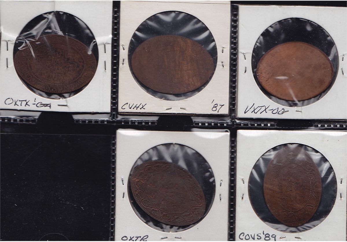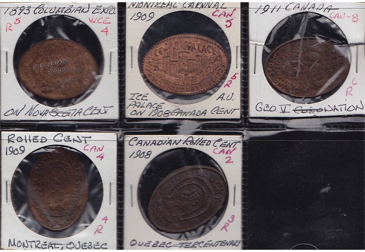 Lot of 5 Elongated Cents. Includes: King George V's coronation, 1911, 1909 Montreal Ice Palace, 1893 Columbian Exposition, 1908 Champlain, Quebec, 1909 Montreal Home Sweet Home. 5 Pcs.