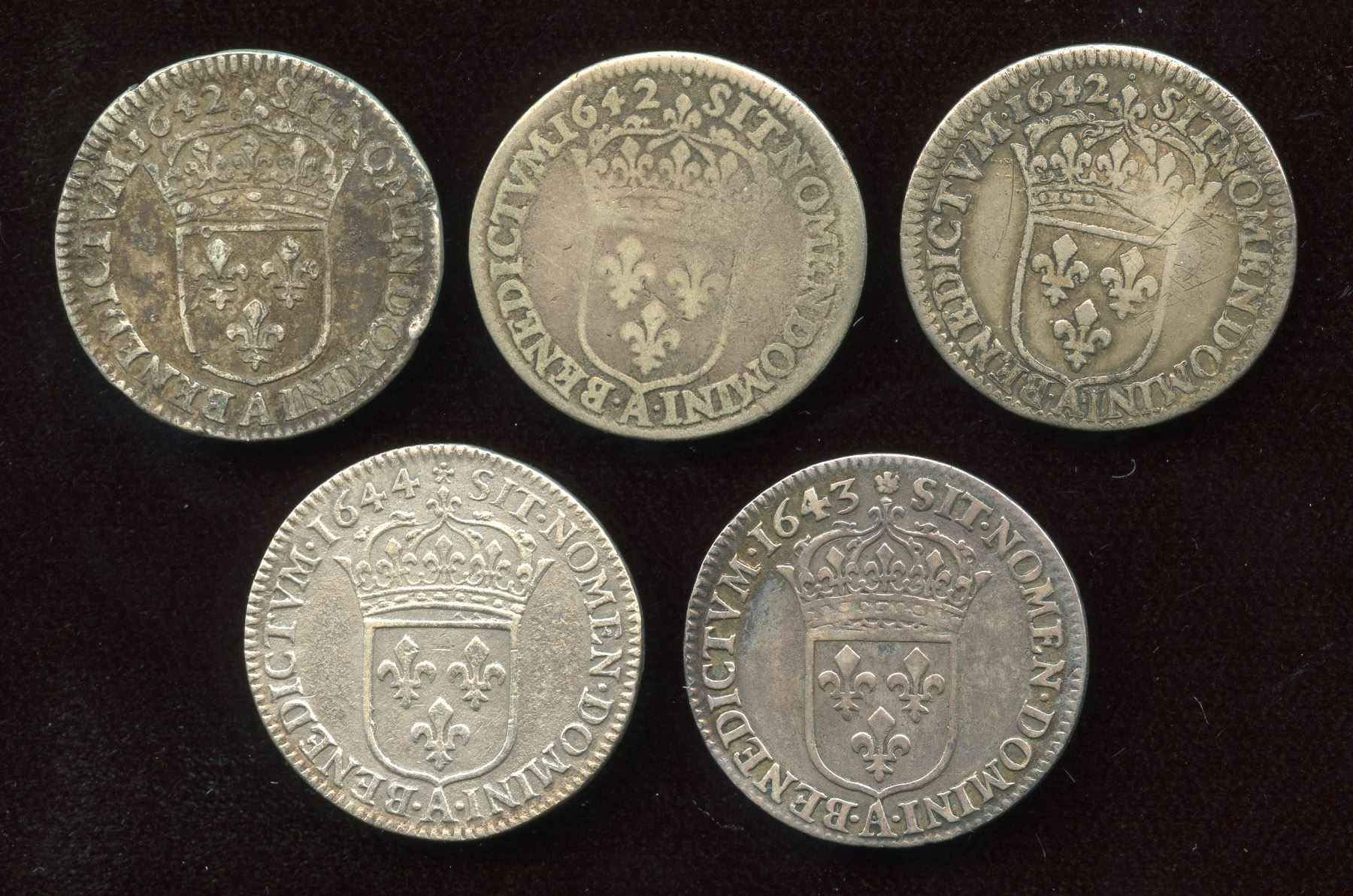 deuxième poinçon de Warin, Louis XIII, 1642A point (3), 1643A rose, G & D 46; 1/12 Ecu à la mèche courte, Louis XIV, 1644A rose, G & D 111. One 1642A is a good VF, but with obv. scratch, the other two are G and VG; the 1643A is a nice VF, the 1644A aEF. 5 Pcs.