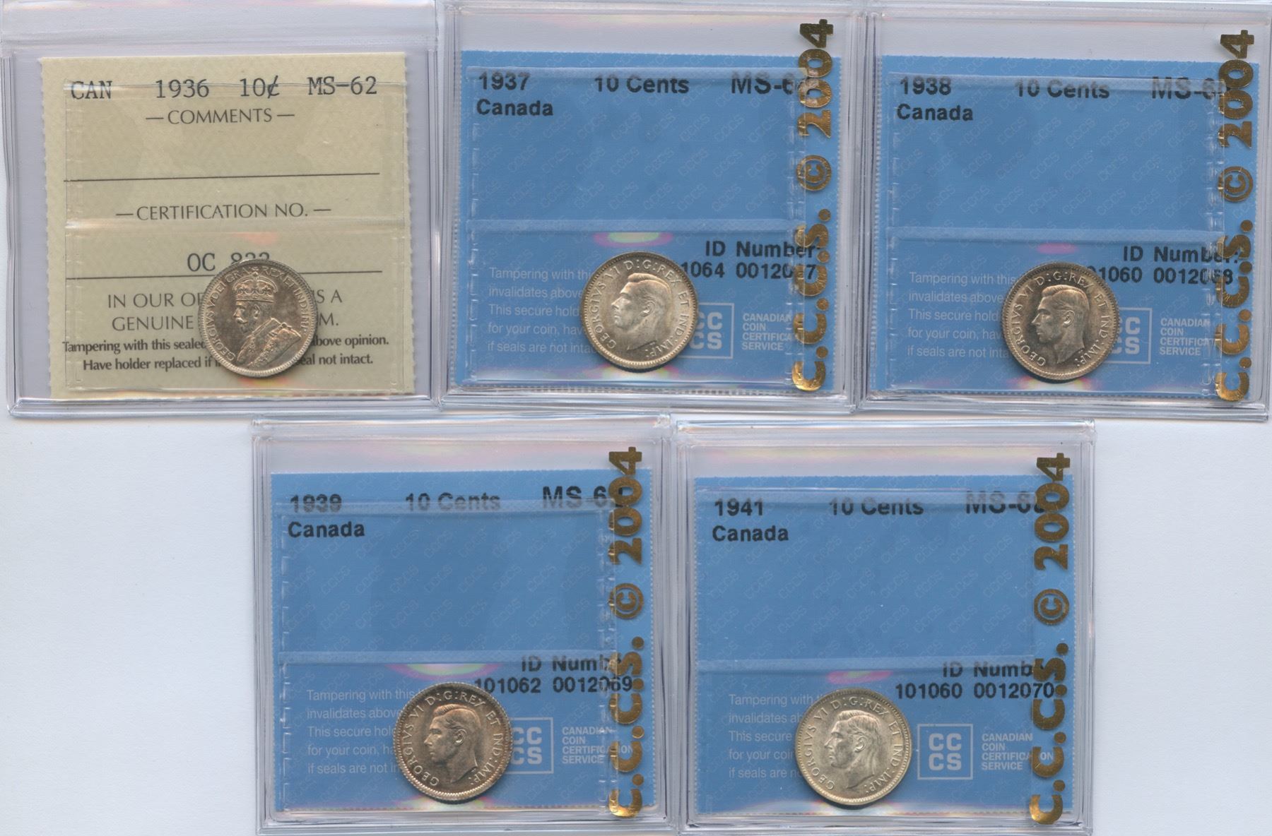 Includes: 1936 ICCS MS-62. 1937 CCCS MS-64. 1938 CCCS MS-60. 1939 CCCS MS-62. 1941 CCCS MS-60. 5 Pcs.