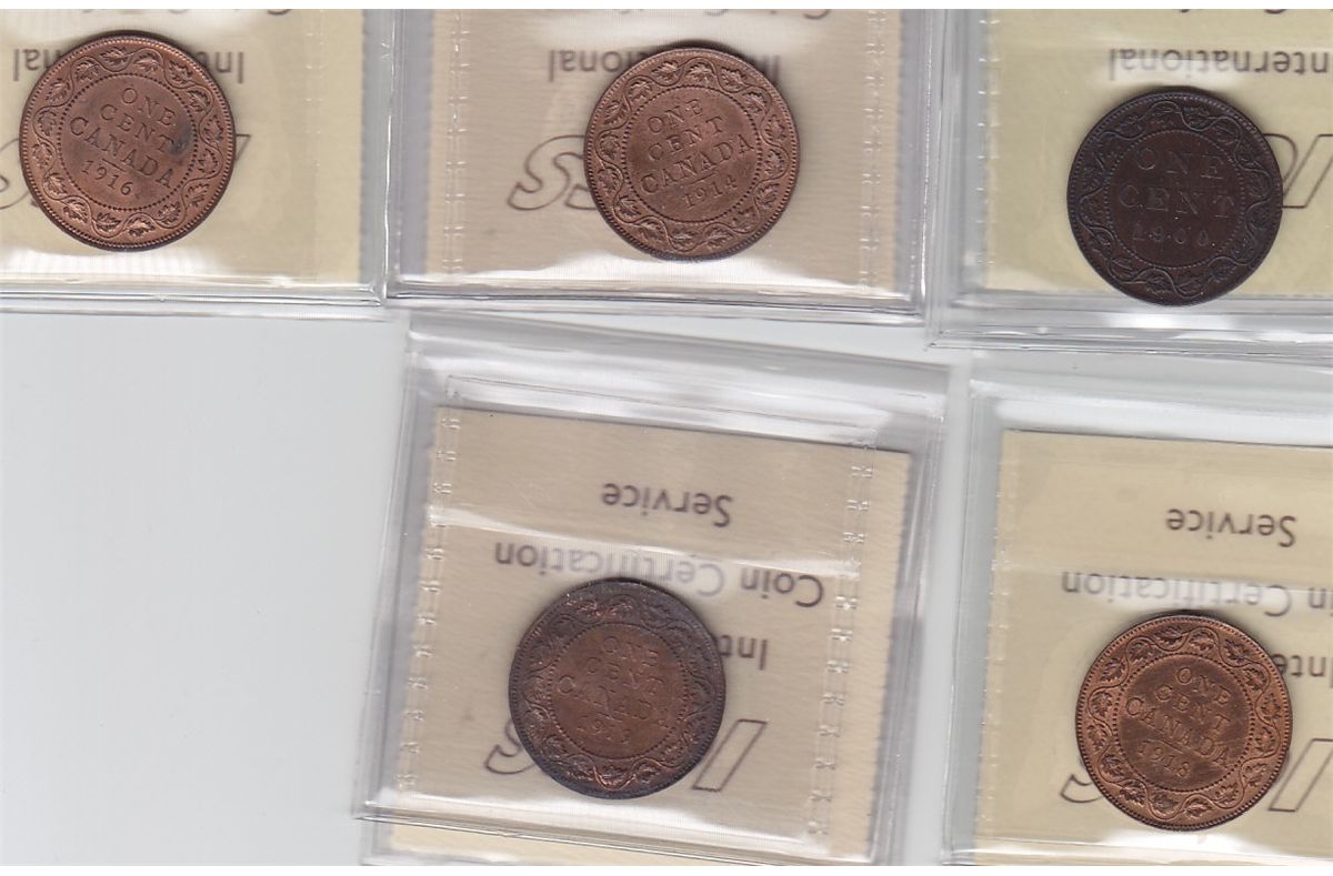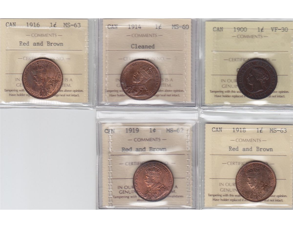 Dates include: 1900 VF-30, 1914 MS-60 Cleaned, 1916 MS-63 Red and Brown, 1918 MS-63 Red and Brown, 1919 MS-62 Red and Brown. 5 Pcs.