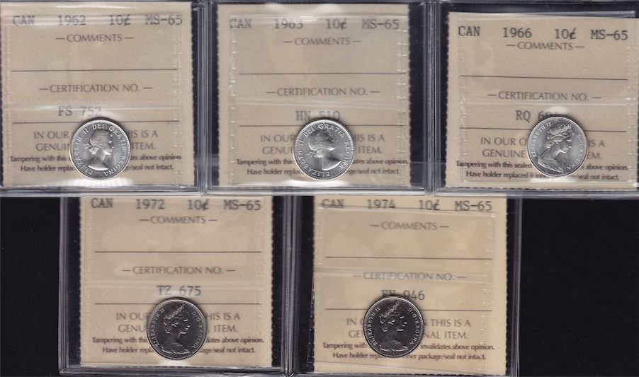 Lot of 5 ICCS Graded Ten Cents. Includes: 1962 MS-65; 1963 MS-65; 1966 MS-65; 1972 MS-65; 1974 MS-65. 5 Pcs.