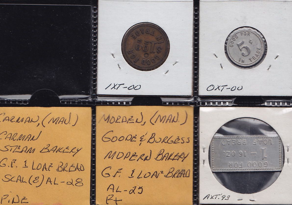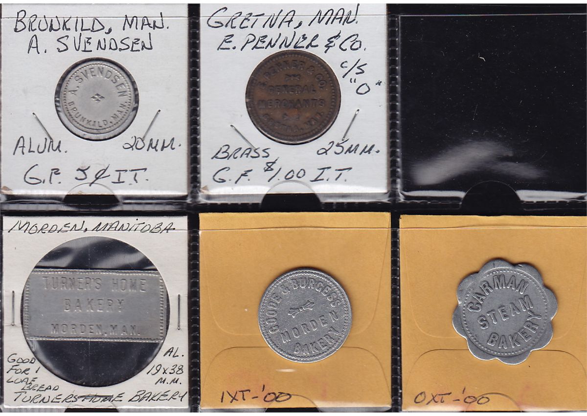 Lot of 5 Manitoba Trade Tokens. Includes: A. Svendsen, Brunkild, MB, 5 cents, aluminum, AU; Carman Steam Bakery, Carman, MB, 1 loaf, VG, aluminum; E. Penner & Co., Gretna, MB, $1.00, brass, VF; Goode & Burgess Bakery, Morden, MB, 1 loaf, VF, aluminum; Turner's Home Bakery, Morden MB, 1 loaf, VF, aluminum. 5 Pcs.