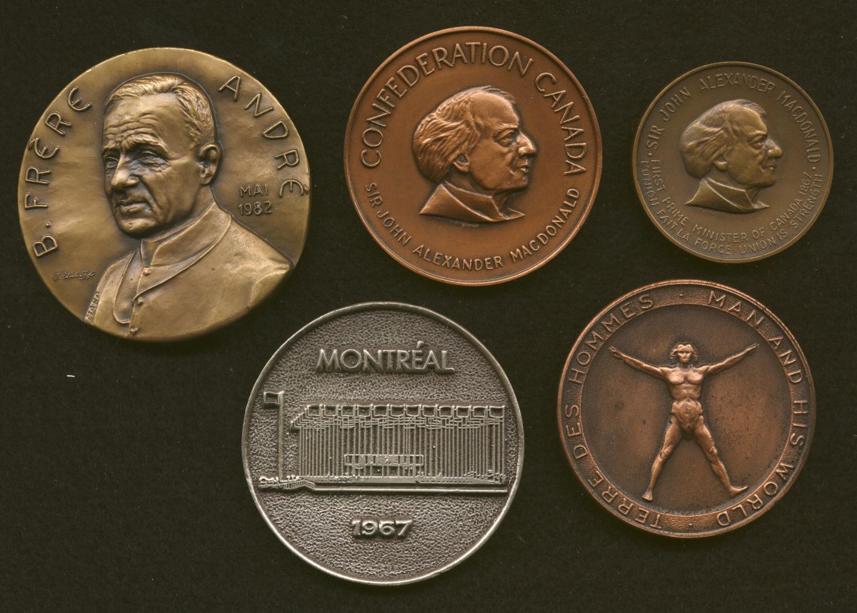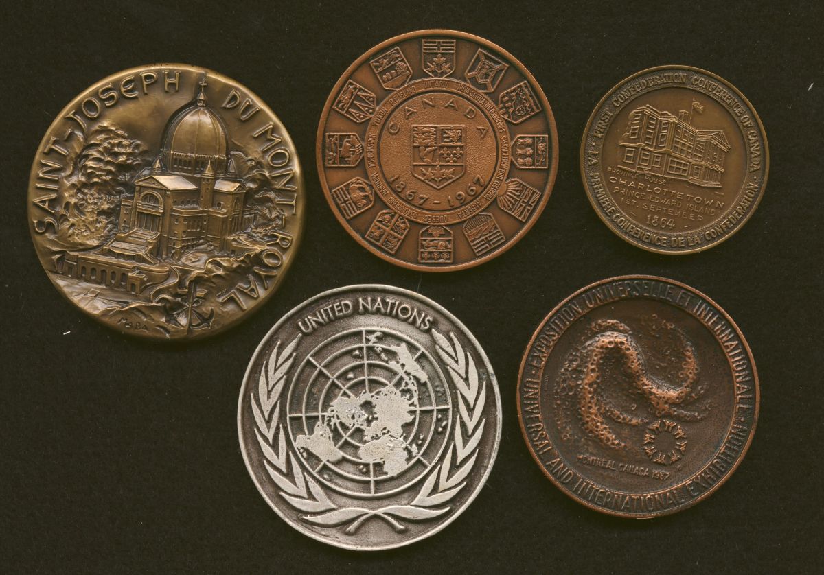 1867 - 1967 Conferation Canada Medal. 1967 Montreal United Nations white metal. 1967 Man and his world. 1982 Saint - Joseph du Mont - Royal, Montreal. 1864 - 1964 Conferation of Canada, Charleottown, PEI