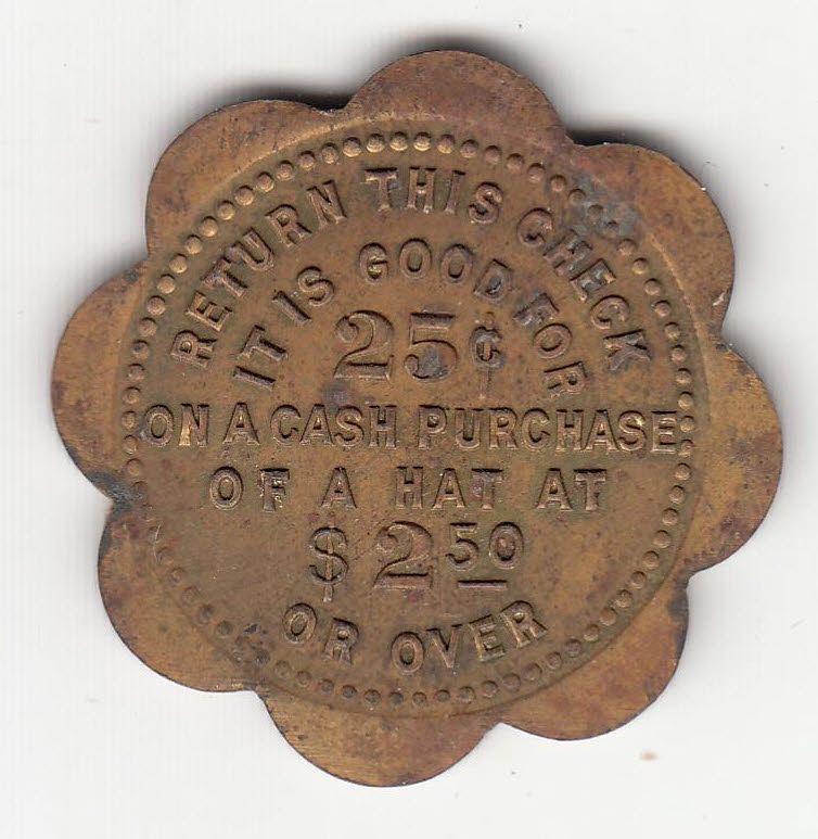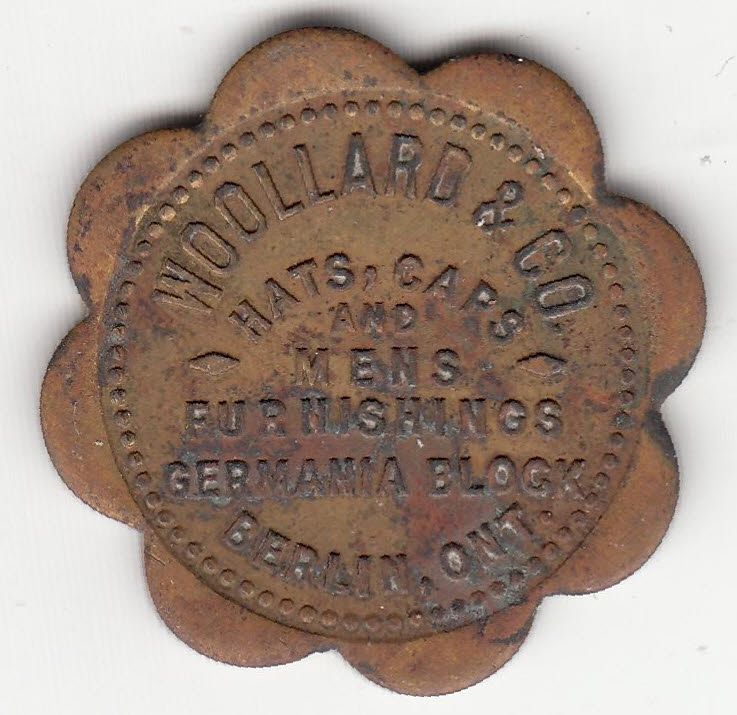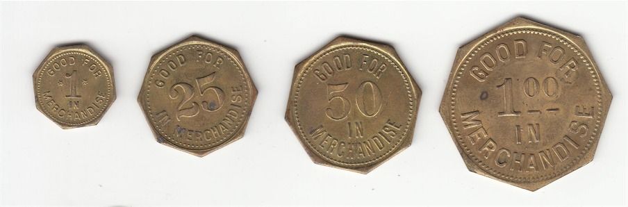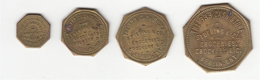 Lot of 5 Merchant Tokens. Includes: 4 brass McColl 392 The 333 Cash Store Stuebing & Co Berlin, Ont Good for 1, 25, 50 and 1.00 in merchandise. and 1 brass McColl 534 Woollard & Co. Good for 25c on a cash purchase of a hat at $2.50 or over. Fine to EF. 5 Pcs.