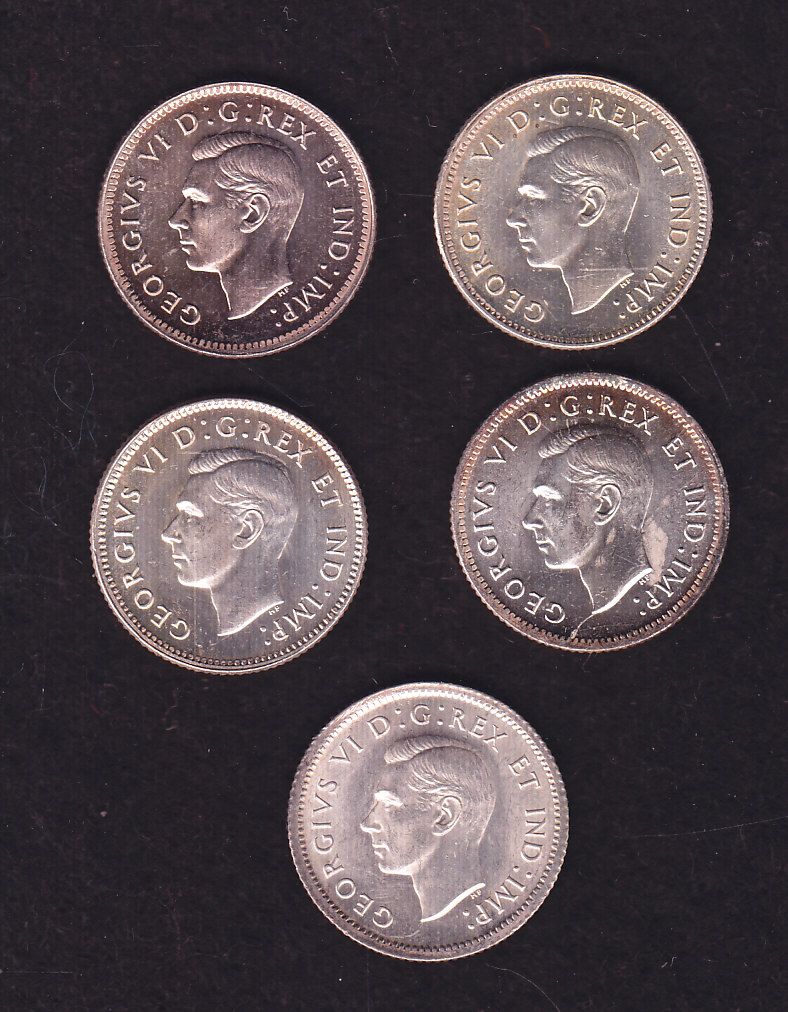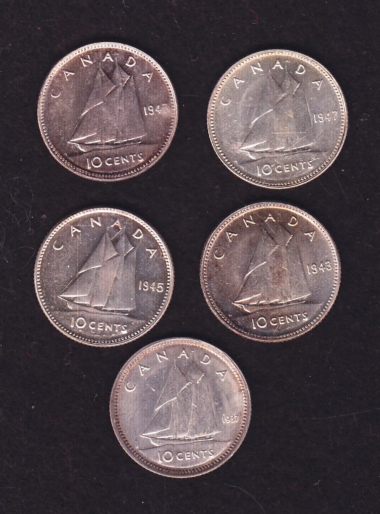 Lot of 5 Mint State Ten Cents - Includes: 1937; 1943; 1945; 1947; 1947 Maple Leaf. 5 Pcs.