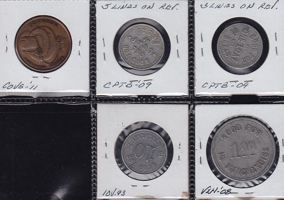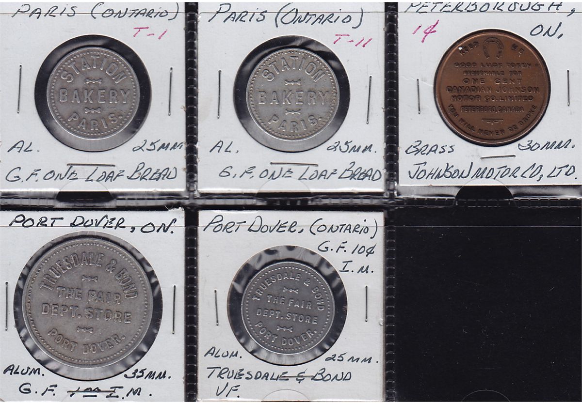 Lot of 5 Ontario Trade Tokens. Station Bakery, Paris, ON, 1 loaf (2 varieties), aluminum, VF, Johnson Motor Co., Peterborough, ON, 1 cent, brass, EF, Truesdale & Bond, Port Dover, ON, 10 cents and $1.00, aluminum, VF. 5 Pcs.