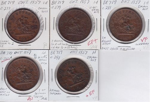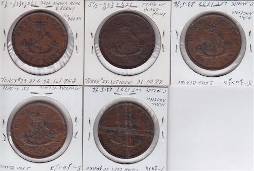 Lot of 5 Province of Canada Tokens - Lot includes: Courteau 277, about VF; Courteau 279, EF+; Courteau 281, VF; Courteau 281a, with additional, unrecorded, die defects, AU; Courteau 290, about EF. 5 Pcs.